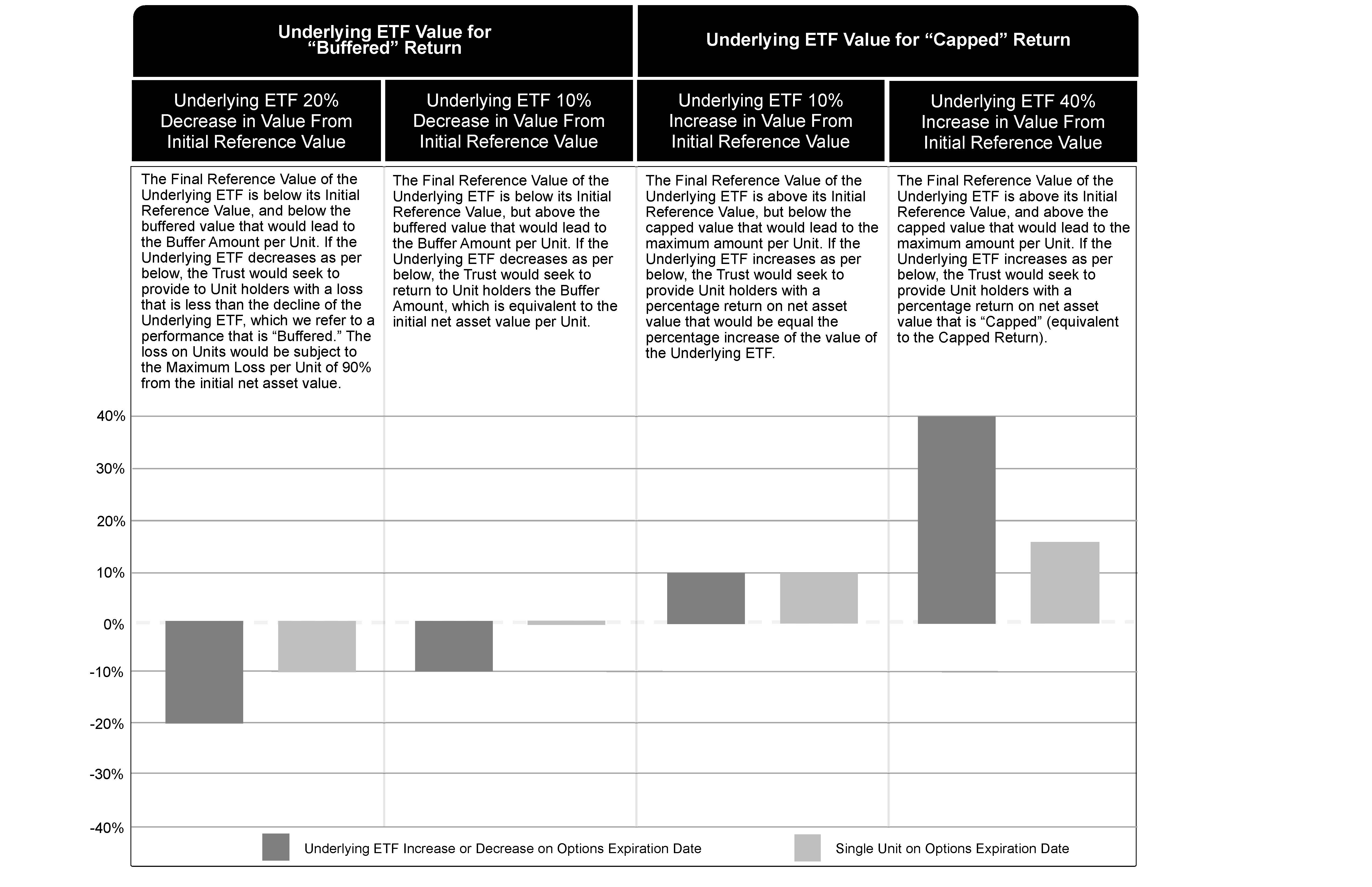 Page 12 What is a FLEX Option? The Trust's initial portfolio includes several types of FLEX Options including purchased and written put and call options (as further described below). The FLEX Options are all European style options, which means that they are exercisable at the strike price only on the FLEX Option Expiration Date. FLEX Options are customized option contracts available through national securities exchanges that are guaranteed for settlement by the OCC, a market clearinghouse. The FLEX Options are listed on the CBOE. FLEX Options provide investors with the ability to customize terms of an option, including exercise prices, exercise styles (European style versus American style options which are exercisable any time prior to the expiration date) and expiration dates, while achieving price discovery in competitive, transparent auctions markets and avoiding the counterparty exposure of the over-the-counter option positions. Each FLEX Option contract entitles the holder thereof (i.e., the purchaser of the FLEX Option) the option to purchase (for the call options) or sell (for the put options) 100 shares of the Underlying ETF as of the close of the market on the FLEX Option Expiration Date at the strike price multiplied by 100. The Trust is designed so that any amount owed by the Trust on the written FLEX Options will be covered by payouts at expiration from the purchased FLEX Options. As a result, the FLEX Options will be fully covered and no additional collateral will be necessary during the life of the Trust. The Trust receives premiums in exchange for the written FLEX Options and pays premiums in exchange for the purchased FLEX Options. The OCC and securities exchange that the FLEX Options are listed on do not charge ongoing fees to writers or purchasers of the FLEX Options during their life for continuing to hold the option contracts. The OCC guarantees performance by each of the counterparties to FLEX Options, becoming the "buyer for every seller and the seller for every buyer," protecting clearing members and options traders from counterparty risk. Subject to determination by the Securities Committee of the OCC, adjustments may be made to the FLEX Options for certain events (collectively, "Corporate Actions") specified in the OCC's by-laws and rules: certain stock dividends or distributions, stock splits, reverse stock splits, rights offerings, distributions, reorganizations, recapitalizations, or reclassifications with respect to an underlying security, or a merger, consolidation, dissolution or liquidation of the issuer of the underlying security. According to the OCC's by-laws, the nature and extent of any such adjustment is to be determined by the OCC's Securities Committee, in light of the circumstances known to it at the time such determination is made, based on its judgment as to what is appropriate for the protection of investors and the public interest, taking into account such factors as fairness to holders and writers (or purchasers and sellers) of the affected options, the maintenance of a fair and orderly market in the affected options, consistency of interpretation and practice, efficiency of exercise settlement procedures, and the coordination with other clearing agencies of the clearance and settlement of transactions in the underlying interest. The information set forth above relating to the FLEX Options and the OCC has been obtained from the OCC. The description and terms of the FLEX Options to be entered into with the OCC are set forth in the by-laws and rules of the OCC, available at www.optionsclearing.com, which is not considered part of this prospectus nor is it incorporated by reference herein. The Trust invests in in-the-money purchased call options, out-of-the-money written call options, at-the-money purchased put options and out-of-the-money written put options. The following discussion describes each type of security. In-The-Money Purchased Call Options ("ITM Purchased Call Options"). The ITM Purchased Call Options are call options purchased by the Trust, each with a strike price significantly lower than the Initial Underlying ETF Level. If the price of the Underlying ETF is less than or equal to the strike price of the ITM Purchased Call Options on the FLEX Option Expiration Date, the ITM Purchased Call Options will expire without net proceeds being payable to the Trust (i.e., the ITM Purchased Call Options will expire worthless). If the price of the Underlying ETF is greater than the strike price on the FLEX Option Expiration Date, then the ITM Purchased Call Options are intended to provide a return to the Trust based on the difference between the strike price of the ITM Purchased Call Options and the price of the Underlying ETF on the FLEX Option Expiration Date equal to a per Unit dollar amount of proceeds of $10.000 multiplied by ((the price of the Underlying ETF on the FLEX Option Expiration Date divided by the Initial Underlying ETF Level) minus 0.00%) on the FLEX Option Expiration Date. The ITM Purchased Call Options are intended to provide approximately one-to-one exposure to the Underlying ETF. Out-Of-The-Money Written Call Options ("OTM Written Call Options"). The OTM Written Call Options are call options written by the Trust, each with a strike price greater than the Initial Underlying ETF Level. If the price of the Underlying ETF is less than or equal to the strike price of the OTM Written Page 13 Call Options on the FLEX Option Expiration Date, the OTM Written Call Options will expire without net proceeds being payable by the Trust (i.e., the OTM Written Call Options will expire worthless). If the price of the Underlying ETF is greater than the strike price on the FLEX Option Expiration Date, then the OTM Written Call Options are intended to provide for the Trust to deliver proceeds to the purchasers of the OTM Written Call Options based on the increase of the price of the Underlying ETF over the strike price of the OTM Written Call