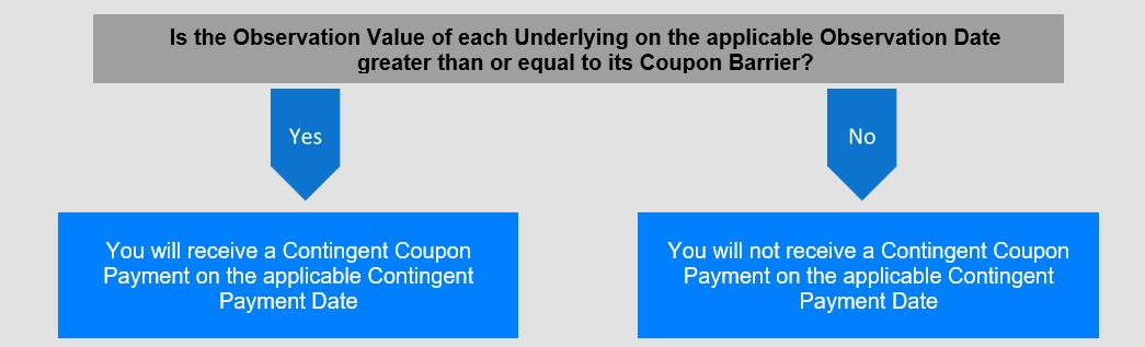 If, on any monthly Observation Date, the Observation Value of each Underlying is greater than or equal to its Coupon Barrier, we will pay a Contingent Coupon Payment of $9.375 per $1,000.00 in principal amount of Notes (equal to a rate of 0.9375% per month or 11.25% per annum) on the applicable Contingent Payment Date (including the Maturity Date).