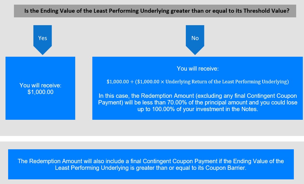 The Redemption Amount will also include a final Contingent Coupon Payment if the Ending Value of the Least Performing Underlying is greater than or equal to its Coupon Barrier.