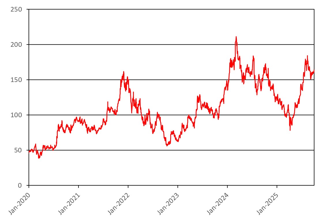 We obtained the information regarding the historical performance of the reference asset in the graph below from Bloomberg, without independent review or verification. The graph below illustrates the performance of the reference asset from January 1, 2020 through October 1, 2025. The closing price of the reference asset on October 1, 2025 was $164.01.