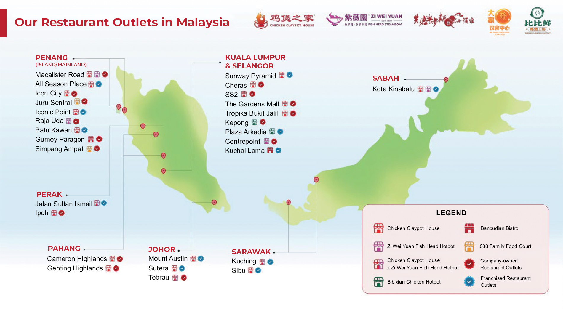 We offer catering services in Malaysia and outside Malaysia mainly under two brands, namely Chicken Claypot House (鸡煲之家) for our chicken hotpot restaurants and Zi Wei Yuan (紫薇园) for our fish head hotpot restaurants through a combination of company-owned restaurant outlets and franchised restaurant outlets. As of the date of this prospectus, we operate or license a total of 34 restaurant outlets, among which there are 20 Chicken Claypot House restaurant outlets, four Zi Wei Yuan restaurant outlets, three Chicken Claypot House-Zi Wei Yuan cross-over restaurant outlets, two food courts under the brand 888 Family Food Court, three restaurant outlets under the brand Bibixian (比比鲜) focusing on Teochew-style chicken hotpot, and two restaurant outlets under the brand Banbudian Bistro (先启半步颠) offering Sichuan cuisine. Among the 30 restaurant outlets operated or licensed by us in Malaysia, there are 16 company-owned restaurant outlets and 14 franchised restaurant outlets, as of the date of this prospectus. Currently, we also have four franchised restaurant outlets located in three other countries including Thailand, Indonesia and China.