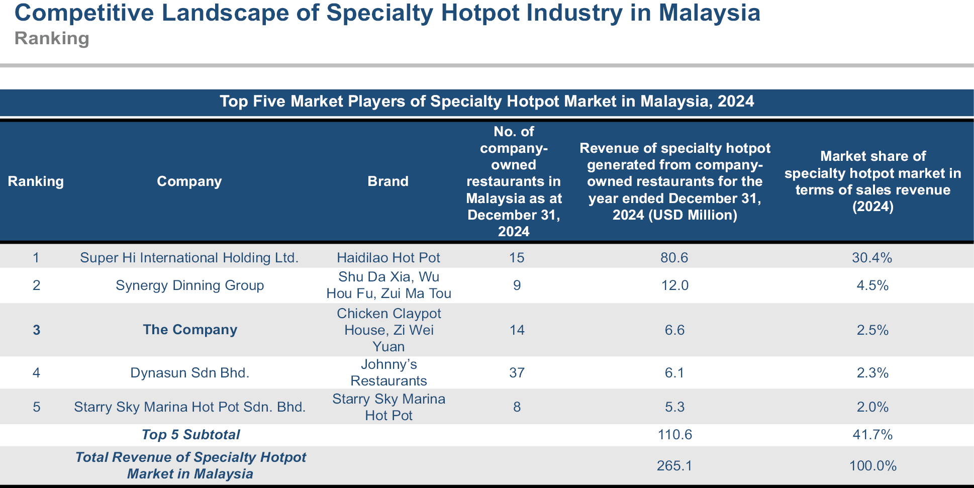 We are one of the leading specialty hotpot restaurant chains in Malaysia, specializing in chicken hotpot and fish head hotpot. With roots in George Town, Penang, Malaysia since 2015, we have become a top player in the specialty hotpot market in Malaysia. According to Frost & Sullivan, we were the third largest specialty hotpot restaurant chain in Malaysia in terms of revenues generated by company-owned restaurants for the year ended December 31, 2024. Our Chicken Claypot House (鸡煲之家) brand, according to Frost & Sullivan, was the largest chicken hotpot brand in Malaysia in terms of number of restaurant outlets as of June 30, 2025.