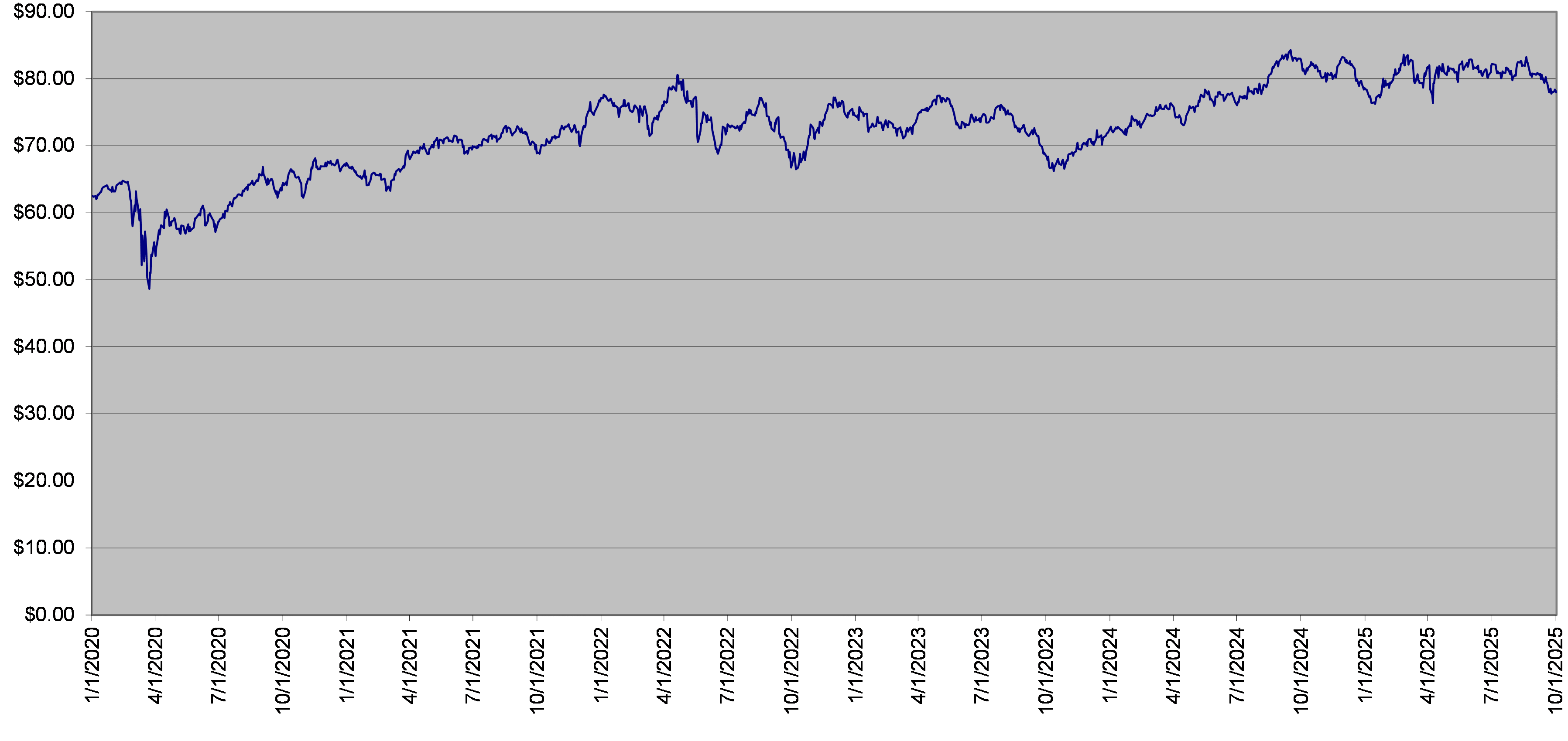 XLP Fund Daily Closing Levels January 1, 2020 to October 2, 2025 |