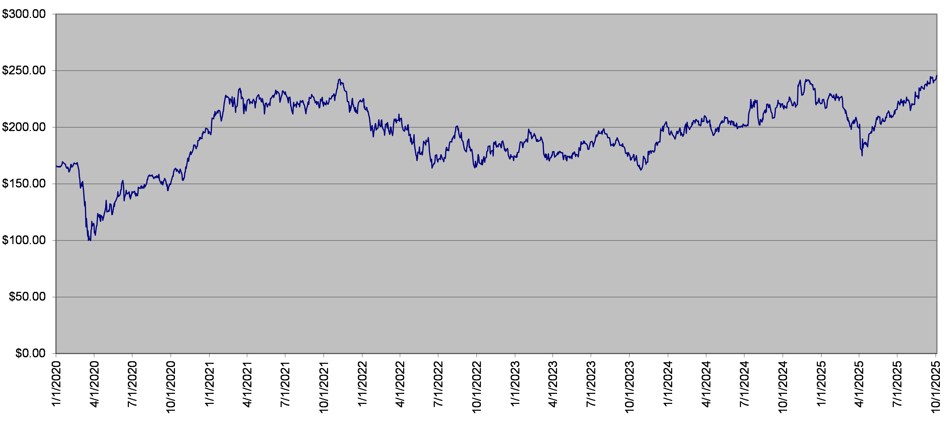 IWM Fund Daily Closing Levels January 1, 2020 to October 3, 2025 |