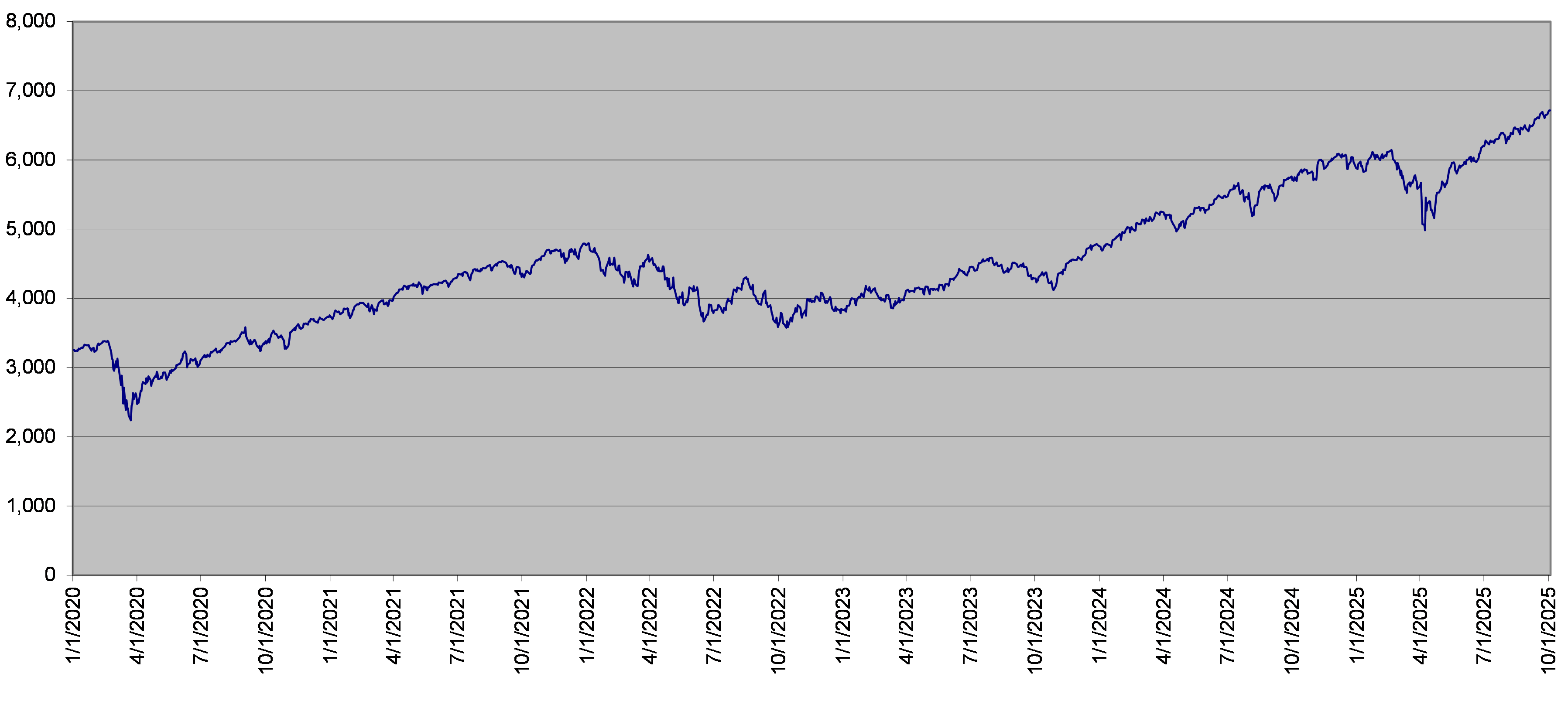 SPX Index Daily Closing Levels January 1, 2020 to October 3, 2025 |