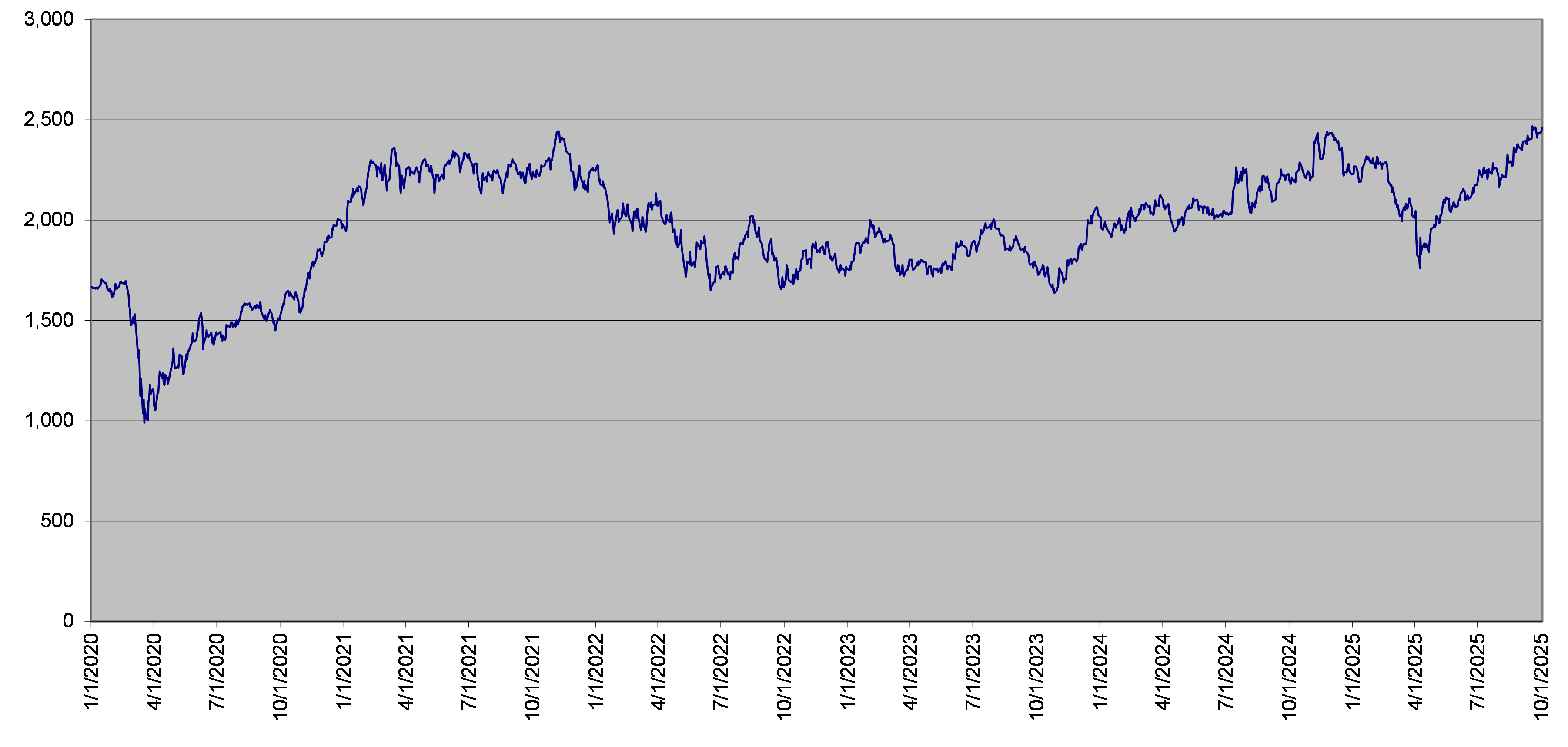 RTY Index Daily Closing Levels January 1, 2020 to October 2, 2025 |