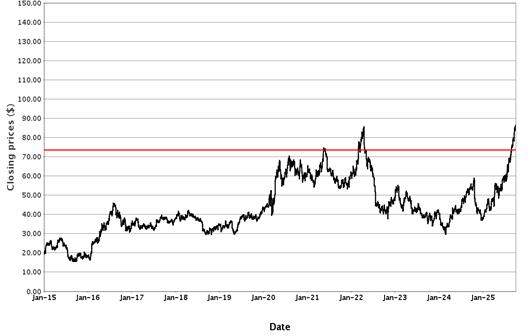 The following graph sets forth historical closing values of the Underlying for the period from January 1, 2015 to October 2, 2025. The solid line represents the Conversion Price. We obtained the information in the graph from Bloomberg Financial Markets, without independent investigation. The historical performance of the Underlying should not be taken as an indication of its future performance. We cannot give you assurance that the performance of the Underlying will result in the return of all of your initial investment.