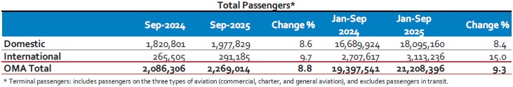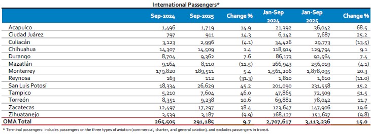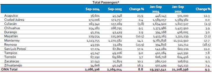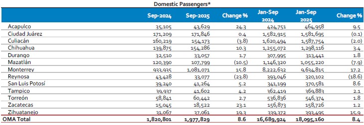Mexico City, Mexico, October 6, 2025—Mexican airport operator Grupo Aeroportuario del Centro Norte, S.A.B. de C.V., known as OMA (NASDAQ: OMAB; BMV: OMA), reports that terminal passenger traffic at its 13 airports increased 8.8% in September 2025, as compared to September 2024. Domestic traffic increased 8.6%, and international traffic increased 9.7%.