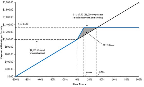 ▪ | The securities offer leveraged exposure to a limited range of potential appreciation of the underlying shares as described below. In exchange for that feature, investors in the securities must be willing to forgo (i) any appreciation of the underlying shares in excess of the maximum return at maturity specified below and (ii) any dividends that may be paid on the underlying shares. In addition, investors in the securities must be willing to accept full downside exposure to any depreciation of the underlying shares. If the closing price of the underlying shares on the valuation date is less than the initial share price, you will lose 1% of the stated principal amount of your securities for every 1% by which the final share price is less than the initial share price. There is no minimum payment at maturity. |