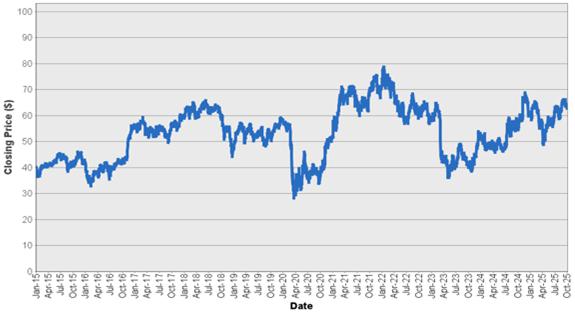Shares of the SPDR® S&P® Regional Banking ETF – Historical Closing Prices January 2, 2015 to October 3, 2025 |