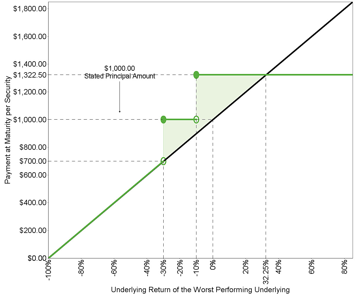 Example 3—Downside Scenario. The final underlying value of the worst performing underlying on the final valuation date is 30.00, resulting in a -70.00% underlying return for the worst performing underlying on the final valuation date. In this example, the final underlying value of the worst performing underlying on the final valuation date is less than its final barrier value.