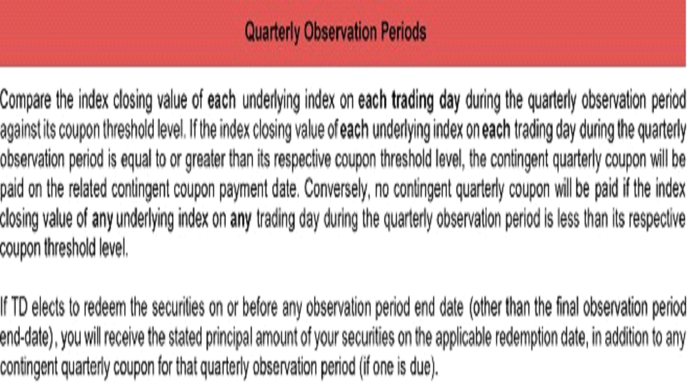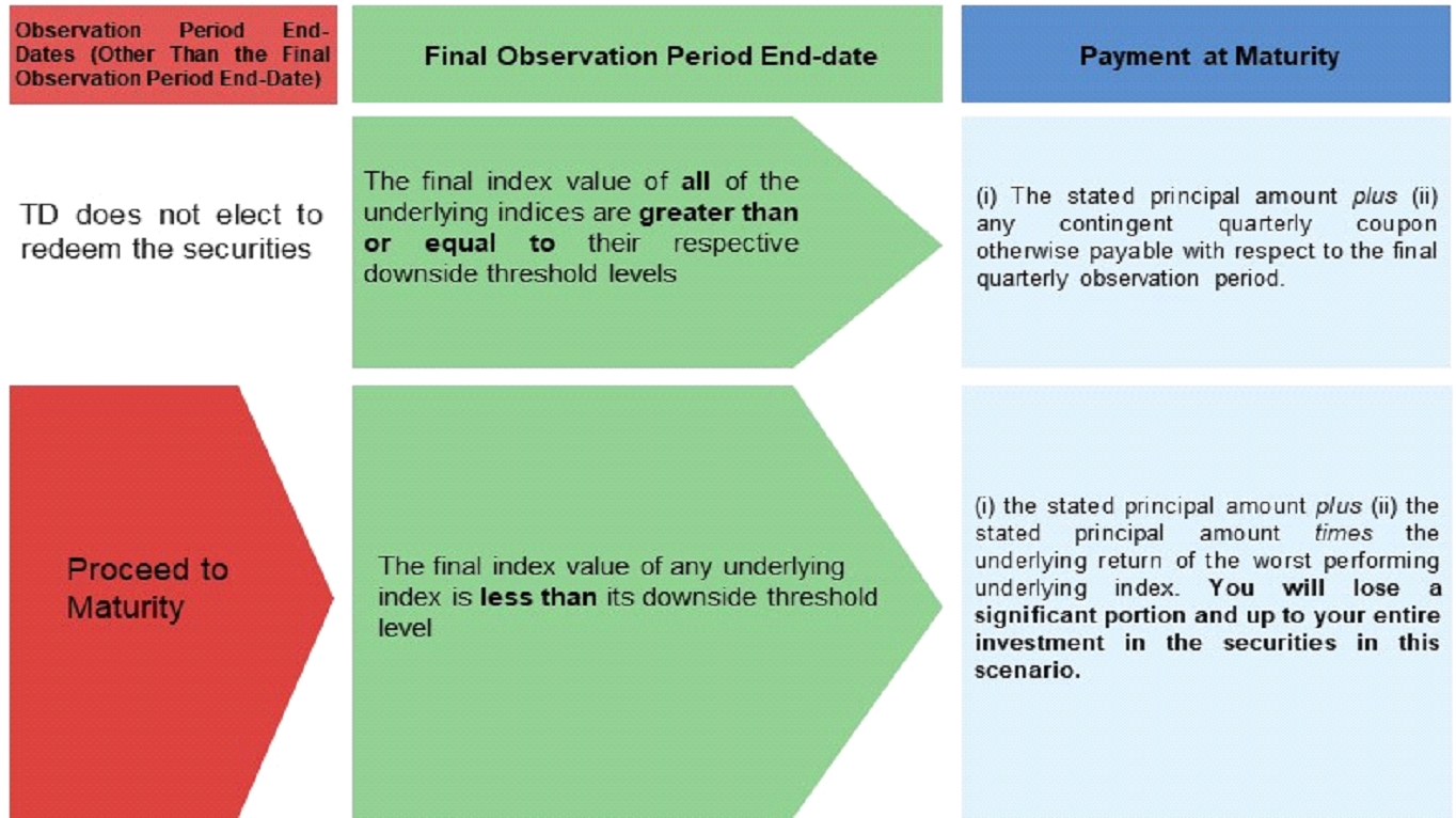 end-date. If TD elects to redeem the securities prior to maturity, the securities will be redeemed for an amount per security equal to the early redemption payment on the redemption date. No further payments will be made on the securities