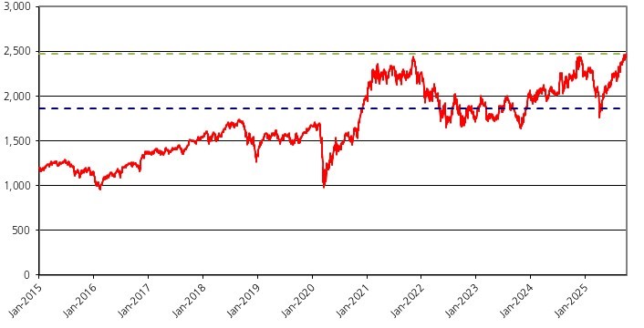 The graph below illustrates the performance of the underlying asset from January 1, 2015 through October 3, 2025, based on the daily closing levels as reported by Bloomberg Professional® service (“Bloomberg”), without independent verification. BNS has not conducted any independent review or due diligence of publicly available information obtained from Bloomberg. The closing level of the underlying asset on October 3,, 2025 was 2,476.178 (the “hypothetical initial level”). The green and blue dotted lines respectively represent the hypothetical call threshold level of 2,476.178 and the hypothetical downside threshold of 1,857.13, which are equal to 100.00% and 75.00%, respectively, of the hypothetical initial level. The actual initial level, call threshold level and downside threshold will be determined on the trade date. Past performance of the underlying asset is not indicative of the future performance of the underlying asset during the term of the Notes.