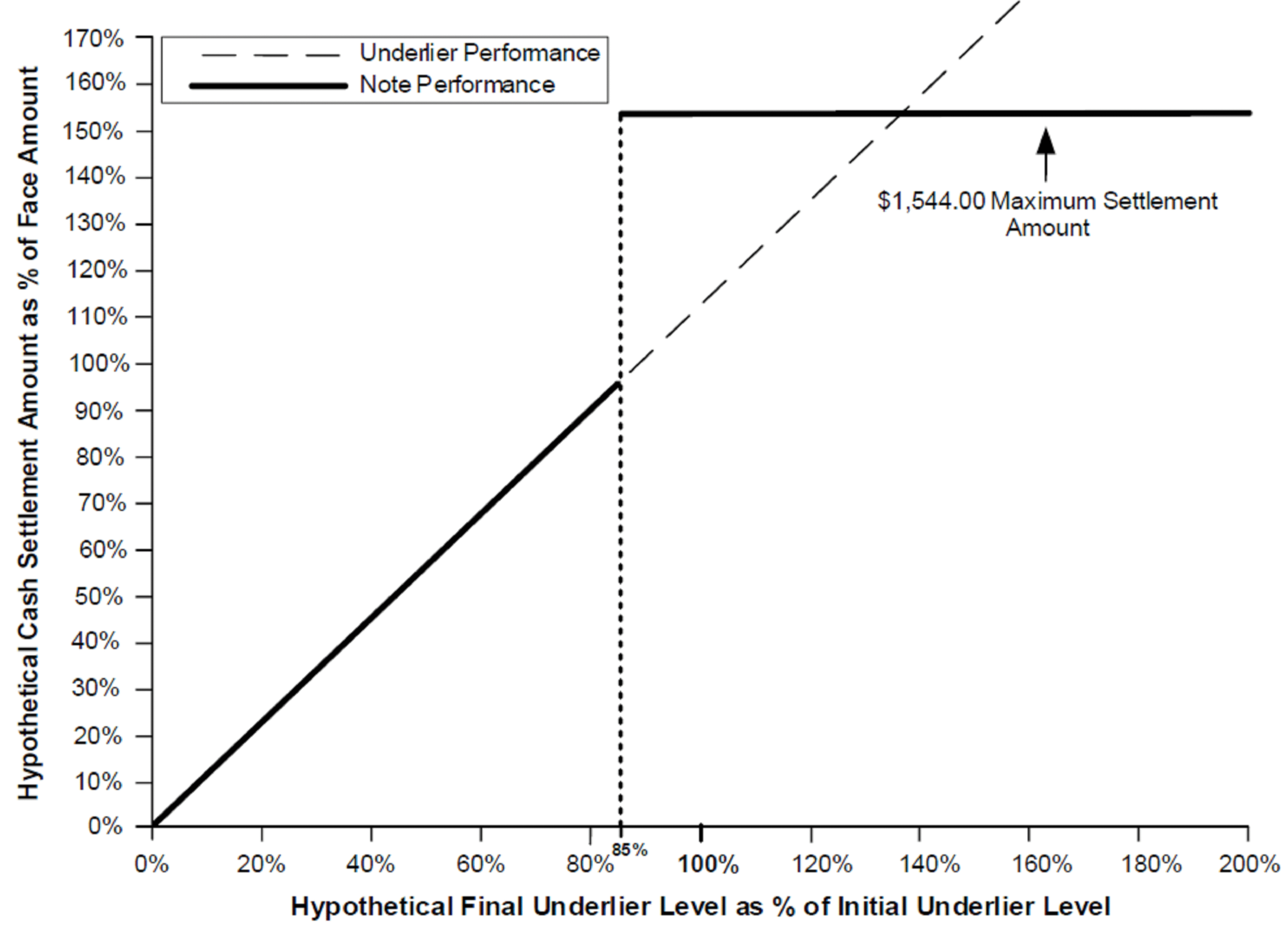 ●if the underlier return is greater than or equal to -15% (the final underlier level is greater than or equal to 85% of the initial underlier level), the maximum settlement amount of $1,544.00 per note, or 154.40% of the face amount; or