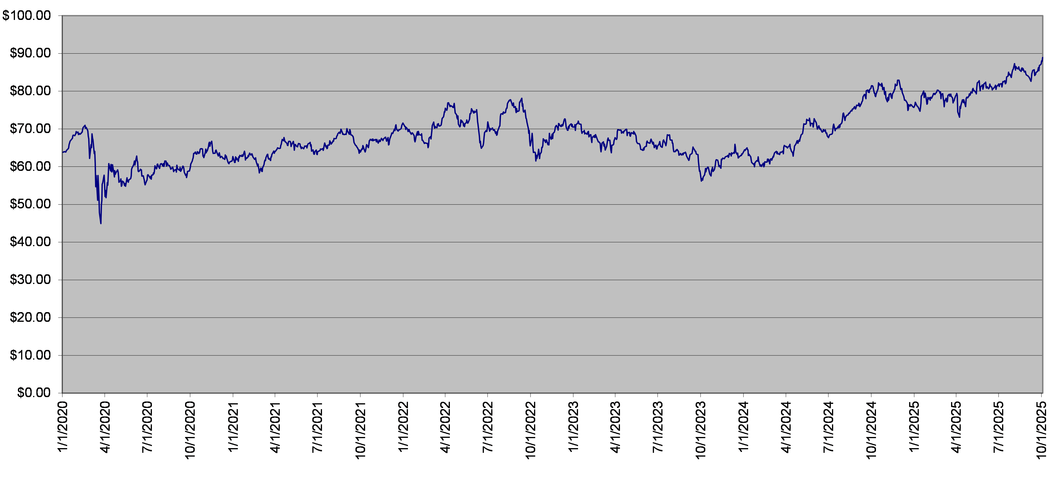 XLU Fund Daily Closing Levels January 1, 2020 to October 3, 2025 |