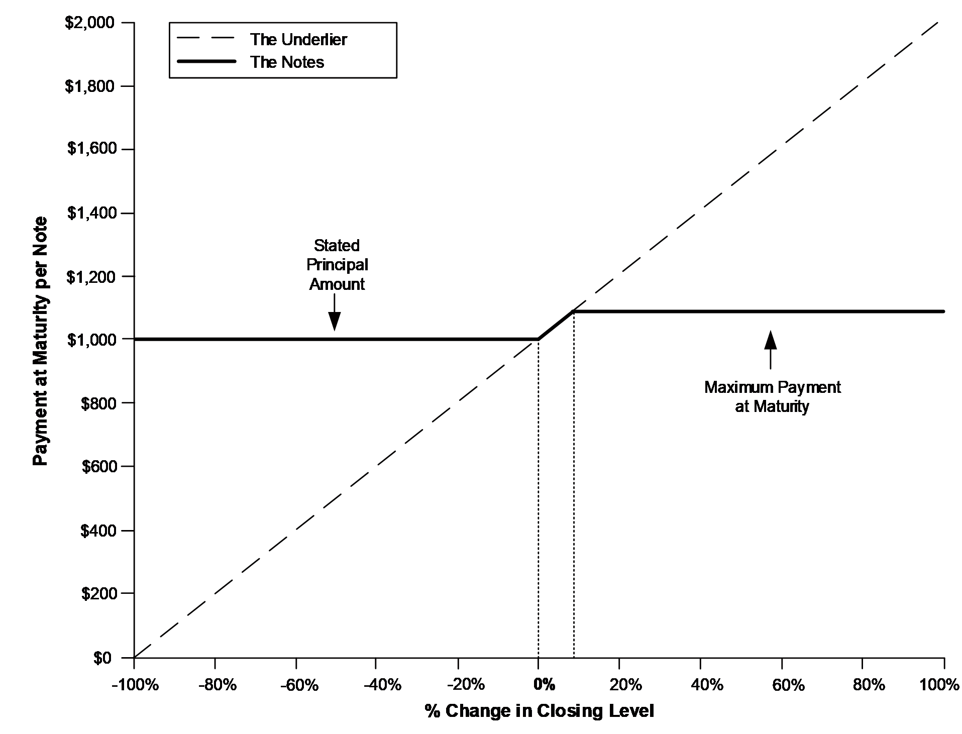 ■Payment at maturity. At maturity, if the final level is greater than the initial level, investors will receive the stated principal amount plus the upside payment, subject to the maximum payment at maturity. If, however, the final level is equal to or less than the initial level, investors will receive only the stated principal amount at maturity.