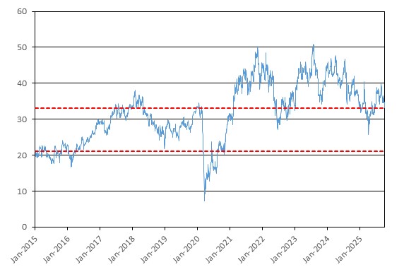 The graph below illustrates the performance of MGM’s common stock from January 1, 2015 through October 7, 2025, based on the daily closing levels as reported by Bloomberg, without independent verification. UBS has not conducted any independent review or due diligence of any publicly available information obtained from Bloomberg. The closing level of MGM’s common stock on October 7, 2025 was $33.12. The dotted lines respectively represent the call threshold level of $33.12, which is equal to 100.00% of the initial level, and the coupon barrier and downside threshold of $21.09, which is equal to 63.67% of the initial level. Past performance of the underlying asset is not indicative of the future performance of the underlying asset during the term of the Notes.