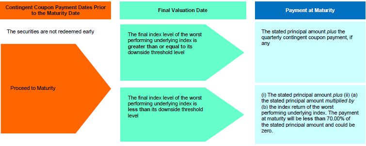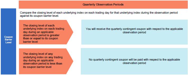 The following diagrams illustrate potential payments on the securities. The first diagram illustrates how to determine whether a contingent coupon payment will be paid with respect to a quarterly observation period. The second diagram illustrates how to determine the payment at maturity if the securities are not redeemed by us prior to maturity.