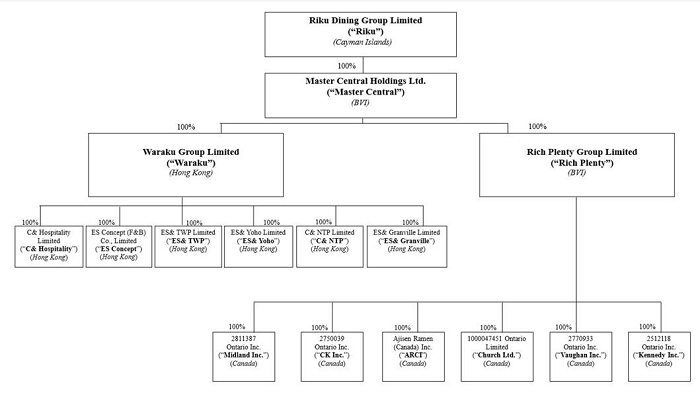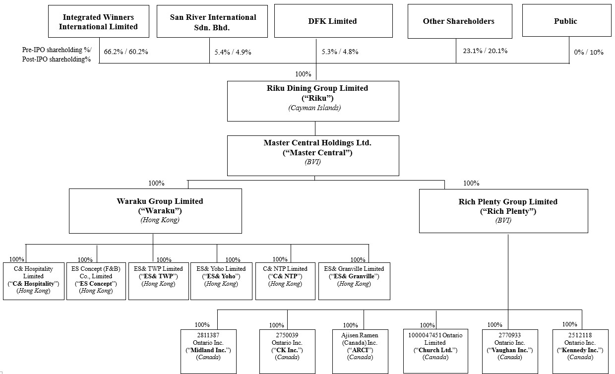 Riku is a holding company incorporated in the Cayman Islands. As a holding company with no material operations, Riku conducts its operations in Canada through its operating subsidiaries in Canada, including Ajisen Ramen (Canada) Inc., 2750039 Ontario Inc., 2512118 Ontario Inc., 2770933 Ontario Inc., 2811387 Ontario Inc. and 1000047451 Ontario Limited (collectively the “CA Operating Subsidiaries”) and in Hong Kong through its operating subsidiaries in Hong Kong, including C& NTP Limited, C& Hospitality Limited, ES Concept (F&B) Co., Limited, ES& TWP Limited, ES& Yoho Limited and ES& Granville Limited (collectively the “HK Operating Subsidiaries”). Investors are cautioned that they are buying shares of a Cayman Islands holding company with operations conducted in Hong Kong and Canada through its Operating Subsidiaries. Riku is not a Chinese or Hong Kong operating company but is a holding company incorporated in the Cayman Islands. This is an offering of the Class A Ordinary Shares of Riku, the holding company incorporated in the Cayman Islands, instead of shares of its HK Operating Subsidiaries and/or its CA Operating Subsidiaries. You may never directly hold any equity interest in its HK Operating Subsidiaries and/or its CA Operating Subsidiaries. This structure involves unique risks to investors, and the PRC regulatory authorities could disallow this structure, which would likely result in a material change in Riku’s operations and/or a material change in the value of the securities Riku is registering for sale, including that such event could cause the value of such securities to significantly decline or become worthless, and further:
