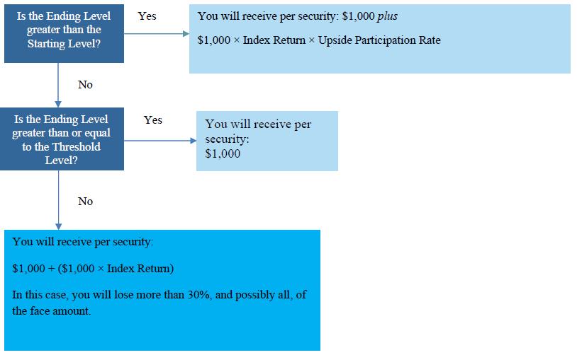 If the Ending Level is less than the Threshold Level, you will have full downside exposure to the decrease in the level of the Index from the Starting Level and will lose more than 30%, and possibly all, of the face amount of your securities at maturity. | |||