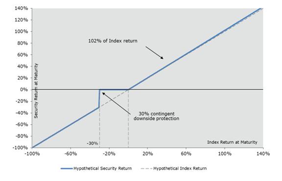 The payout profile, return table and examples below illustrate hypothetical Maturity Payment Amount for a $1,000 face amount security on a hypothetical offering of securities under various scenarios, with the assumptions set forth in the table below. The terms used for purposes of these hypothetical examples do not represent the actual Starting Level or Threshold Level. The hypothetical Starting Level of 100.00 has been chosen for illustrative purposes only and does not represent the actual Starting Level. The actual Starting Level and Threshold Level will be determined on the Pricing Date and will be set forth under “Terms of the Securities” above. For historical data regarding the actual Closing Levels of the Index, see the historical information set forth herein. The payout profile, return table and examples below assume that an investor purchases the securities for $1,000 per security. These examples are for purposes of illustration only and the values used in the examples may have been rounded for ease of analysis. The actual Maturity Payment Amount and resulting pre-tax total rate of return will depend on the actual terms of the securities.