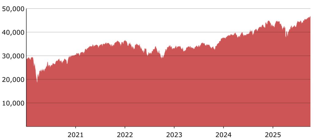 The following graph sets forth daily Closing Levels of the INDU for the period from January 1, 2020 to October 6, 2025. The Closing Level of the INDU on October 6, 2025 was 46,694.97.