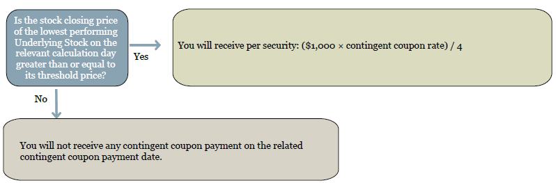 On each contingent coupon payment date, you will receive a contingent coupon payment at a per annum rate equal to the contingent coupon rate if, and only if, the stock closing price of the lowest performing Underlying Stock on the related calculation day is greater than or equal to its threshold price. Each “contingent coupon payment,” if any, will be calculated per security as follows: ($1,000 × contingent coupon rate) / 4. Notwithstanding anything to the contrary in the accompanying product supplement, any contingent coupon payment will be rounded to the nearest cent, with one-half cent rounded upward. If the stock closing price of the lowest performing Underlying Stock on any calculation day is less than its threshold price, you will not receive any contingent coupon payment on the related contingent coupon payment date. If the stock closing price of the lowest performing Underlying Stock on a calculation day is less than its threshold price on all calculation days, you will not receive any contingent coupon payments over the term of the securities. |