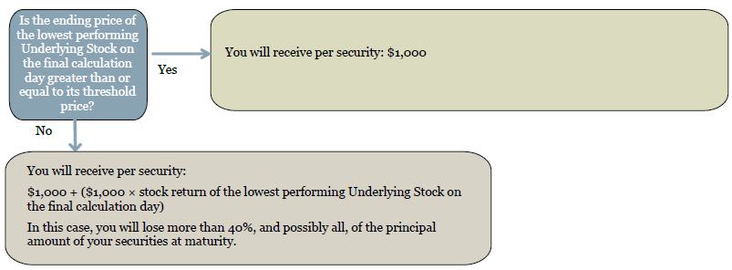 § | You are willing and able to accept the risk that, if the securities are not automatically called and the ending price of the lowest performing Underlying Stock on the final calculation day is less than its threshold price, you will lose more than 40%, and possibly all, of the principal amount of your securities at maturity. |