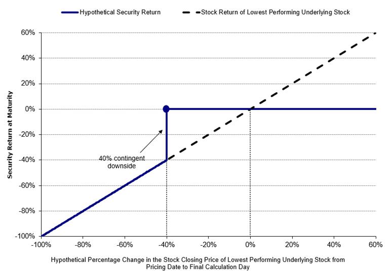 In addition to any contingent coupon payments received during the term of the securities, on the stated maturity date you would receive $400.00 per security. Because the hypothetical ending price of the lowest performing Underlying Stock on the final calculation day is less than its hypothetical threshold price, you will not receive a final contingent coupon payment.