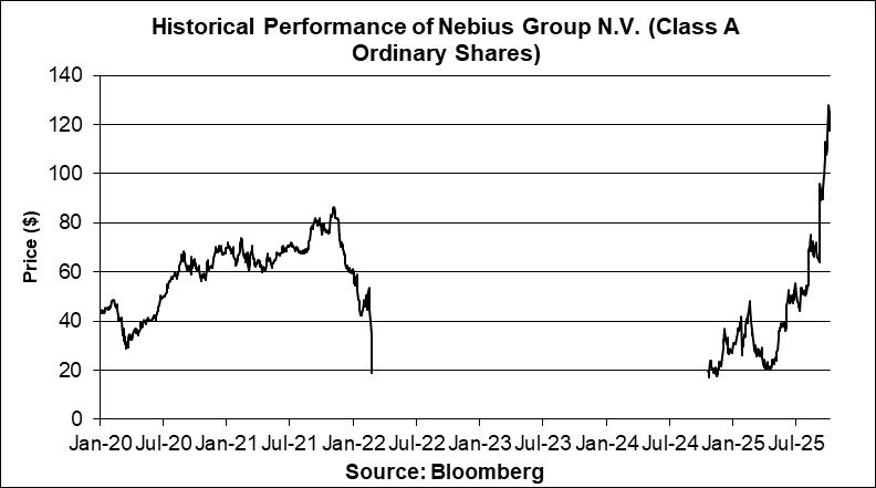 The following graph sets forth the historical performance of the Class A ordinary shares of Nebius Group N.V. based on the daily historical closing prices of the Class A ordinary shares of Nebius Group N.V. from January 3, 2020 through February 25, 2022 and from October 25, 2024 through October 7, 2025. Trading in the Class A ordinary shares of Nebius Group N.V. was halted on The Nasdaq Stock Market from February 28, 2022 through October 18, 2024 and resumed on October 21, 2024 following the divestment of Nebius Group N.V.’s Russian assets. Accordingly, no historical performance for the Class A ordinary shares of Nebius Group N.V. is available for the trading suspension period. The closing price of the Class A ordinary shares of Nebius Group N.V. on October 7, 2025 was $117.70. We obtained the closing prices above and below from the Bloomberg Professional® service (“Bloomberg”), without independent verification. The closing prices above and below may have been adjusted by Bloomberg for corporate actions, such as stock splits, public offerings, mergers and acquisitions, spin-offs, delistings and bankruptcy.