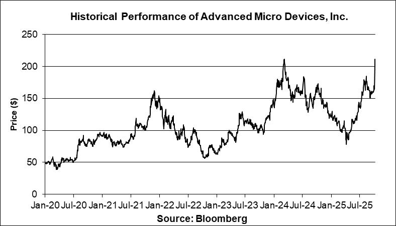 The following graph sets forth the historical performance of the common stock of Advanced Micro Devices, Inc. based on the daily historical closing prices of the common stock of Advanced Micro Devices, Inc. from January 2, 2020 through October 7, 2025. The closing price of the common stock of Advanced Micro Devices, Inc. on October 7, 2025 was $211.51. We obtained the closing prices above and below from Bloomberg, without independent verification. The closing prices above and below may have been adjusted by Bloomberg for corporate actions, such as stock splits, public offerings, mergers and acquisitions, spin-offs, delistings and bankruptcy.