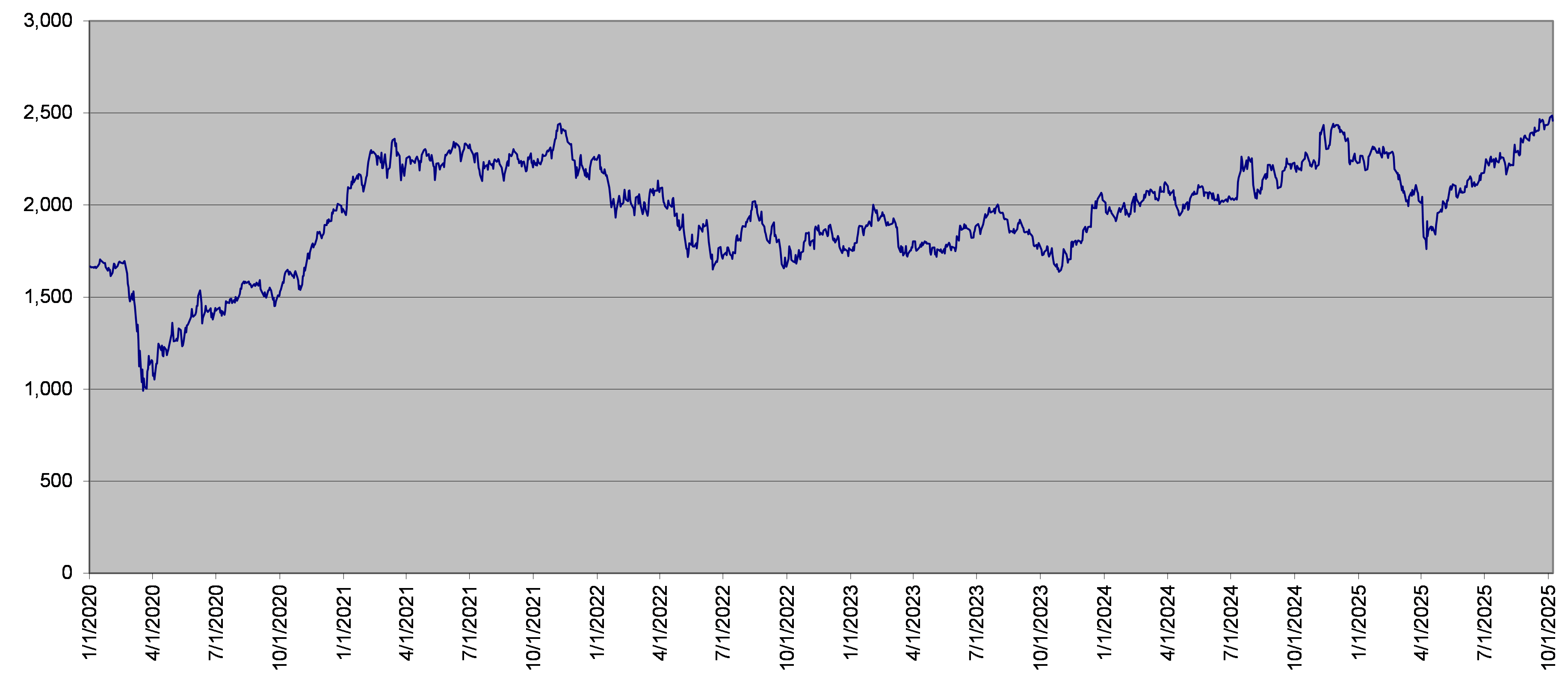 RTY Index Daily Closing Levels January 1, 2020 to October 7, 2025 |