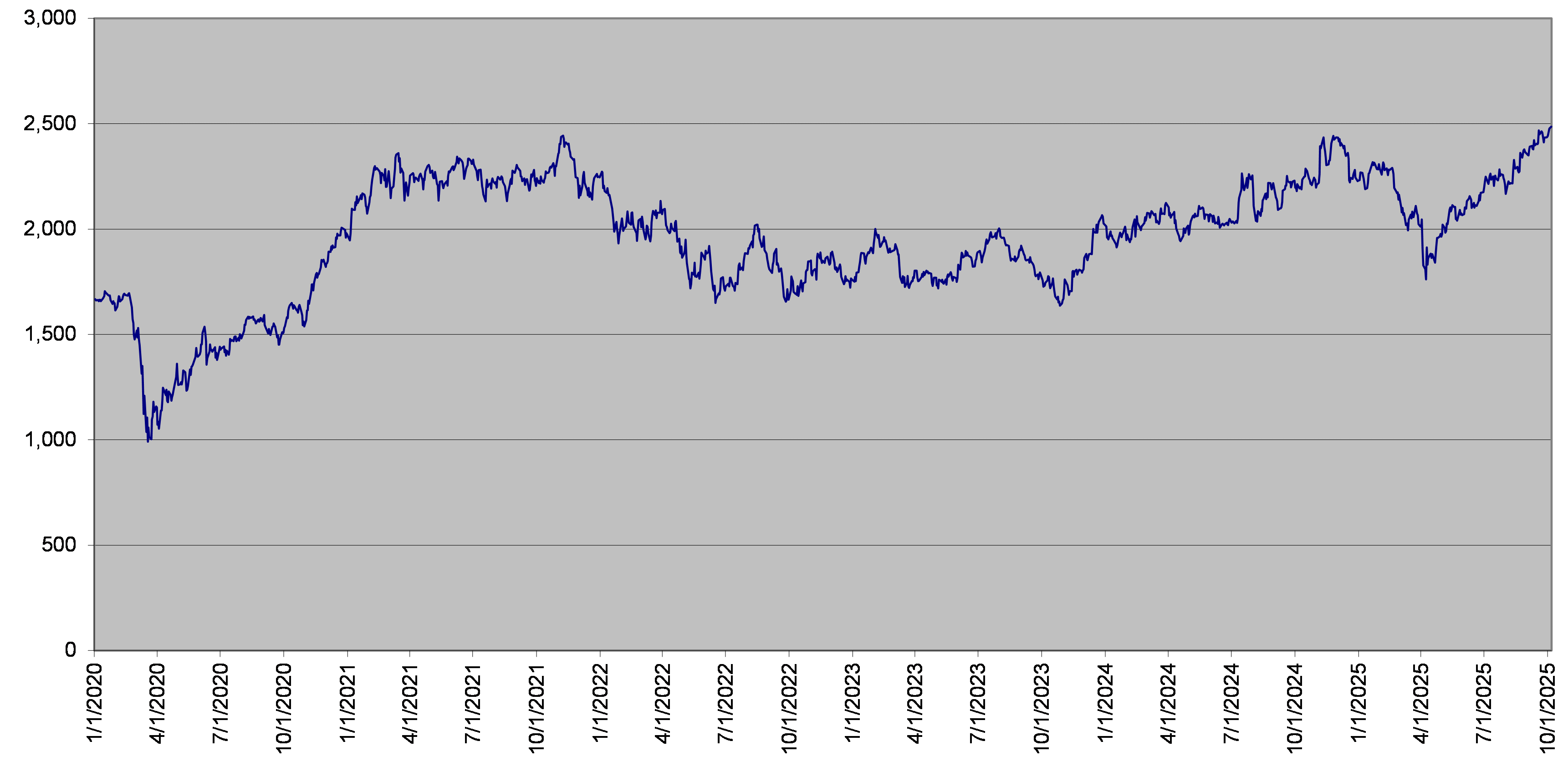 RTY Index Daily Closing Levels January 1, 2020 to October 6, 2025 |