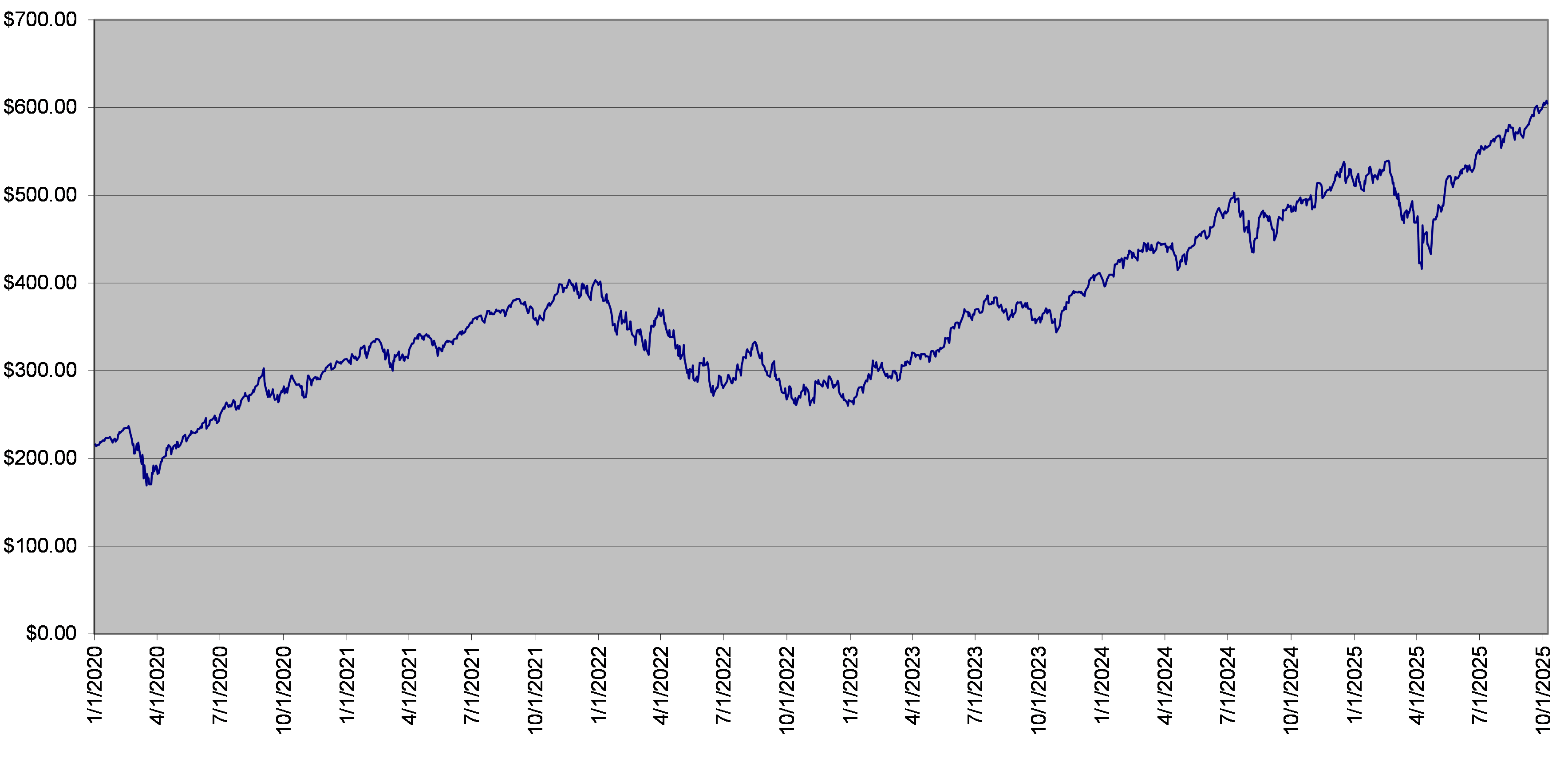 QQQ Fund Daily Closing Levels January 1, 2020 to October 7, 2025 |