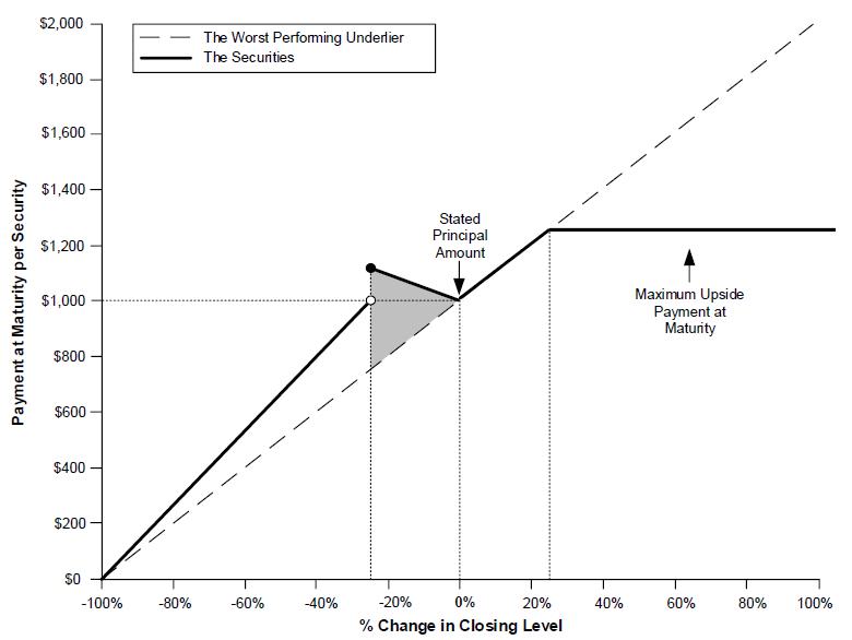 oIf the worst performing underlier appreciates 100%, investors will receive only the maximum upside payment at maturity of $1,251.50 per security, or 125.15% of the stated principal amount.