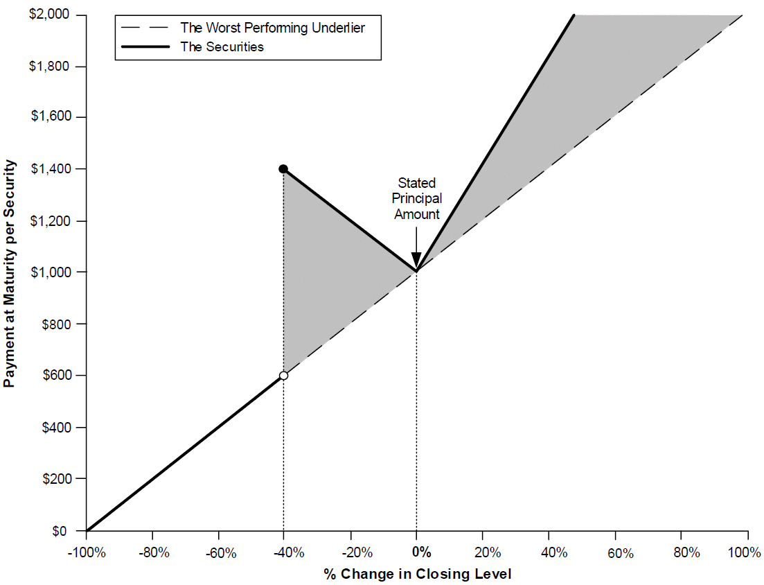 •If the final level of each underlier is greater than its initial level: stated principal amount + leveraged upside payment •If the final level of either underlier is equal to or less than its initial level but the final level of each underlier is greater than or equal to its downside threshold level: stated principal amount + (stated principal amount × absolute underlier return of the worst performing underlier × absolute return participation rate) Under these circumstances, the payment at maturity will effectively be limited to a positive return of 40%. •If the final level of either underlier is less than its downside threshold level: stated principal amount × performance factor of the worst performing underlier Under these circumstances, the payment at maturity will be significantly less than the stated principal amount and could be zero. |