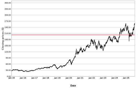 The following graph sets forth historical closing values of the Underlier for the period from January 1, 2015 to October 7, 2025. The red line represents the Barrier Value. We obtained the information in the graph from Bloomberg Financial Markets, without independent investigation. We cannot give you assurance that the performance of the Underlier will result in the return of all of your initial investment.