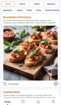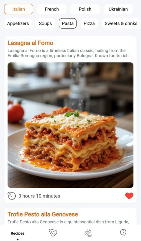Cibatella provides users with step-by-step recipes accompanied by high-quality images, ingredient lists, preparation times, and detailed dish descriptions. Our web app specializes in Polish, Ukrainian, French, and Italian cuisines, allowing users to explore, learn, and cook a variety of traditional and modern dishes.
