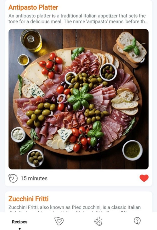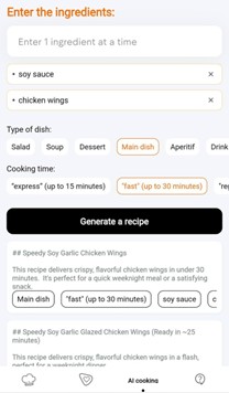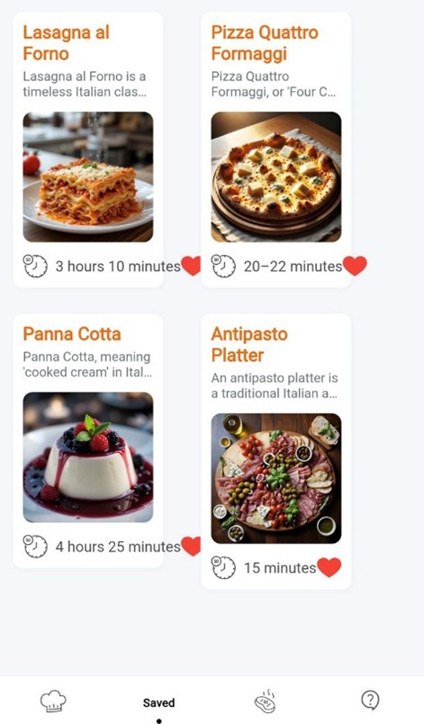 Our web app includes an AI-powered recipe assistant that allows users to input the ingredients they have on hand and receive dish suggestions, complete with preparation steps. Users can also "favorite" recipes they love by tapping the heart icon, making them easy to revisit in the “Saved” section of their profile.