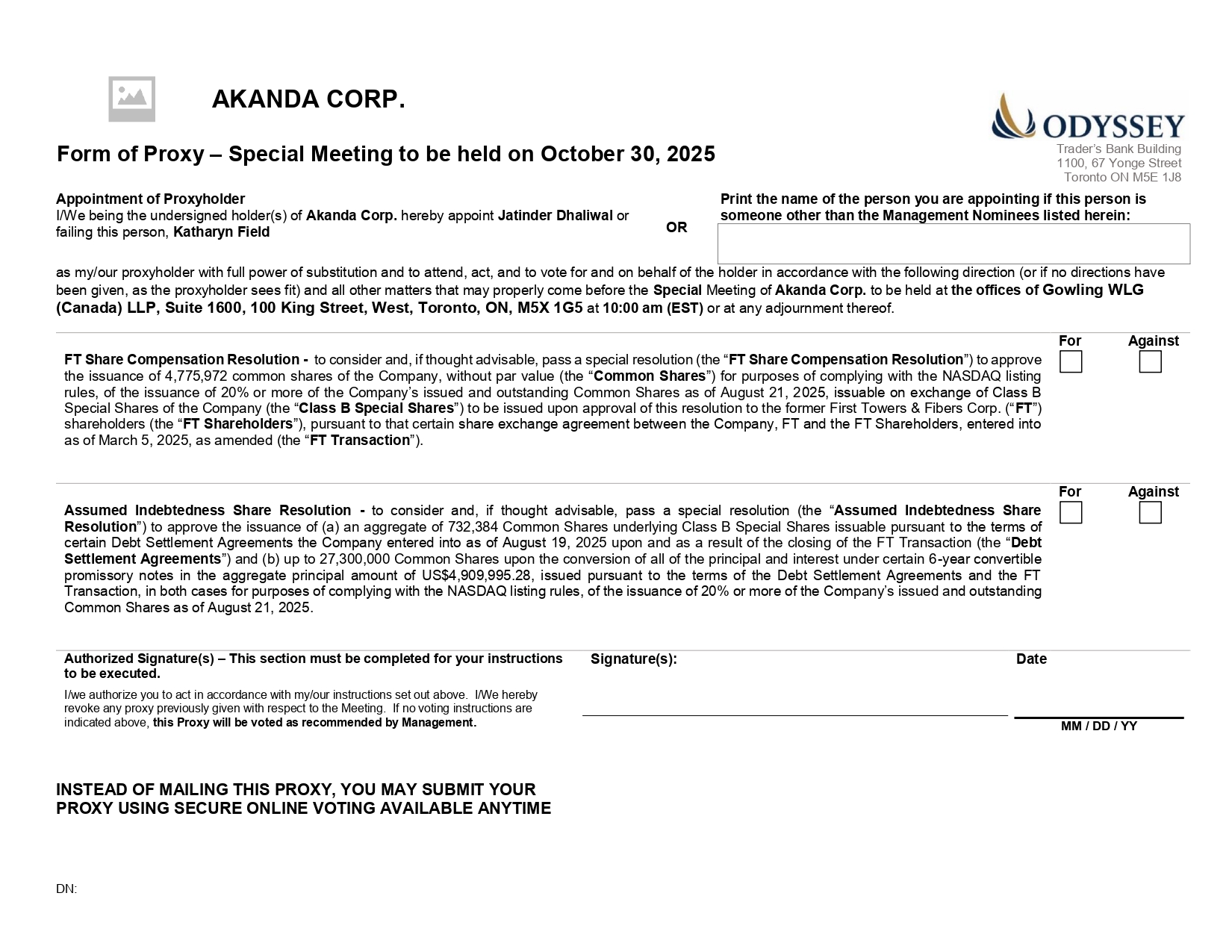 DN: AKANDA CORP. Trader’s Bank Building 1100, 67 Yonge Street Toronto ON M5E 1J8 Form of Proxy – Special Meeting to be held on October 30, 2025 Print the name of the person you are appointing if this person is someone other than the Management Nominees listed herein: Appointment of Proxyholder I/We being the undersigned holder(s) of Akanda Corp. hereby appoint Jatinder Dhaliwal or failing this person, Katharyn Field OR as my/our proxyholder with full power of substitution and to attend, act, and to vote for and on behalf of the holder in accordance with the following direction (or if no directions have been given, as the proxyholder sees fit) and all other matters that may properly come before the Special Meeting of Akanda Corp. to be held at the offices of Gowling WLG (Canada) LLP, Suite 1600, 100 King Street, West, Toronto, ON, M5X 1G5 at 10:00 am (EST) or at any adjournment thereof. For Against FT Share Compensation Resolution - to consider and, if thought advisable, pass a special resolution (the “ FT Share Compensation Resolution ”) to approve the issuance of 4 , 775 , 972 common shares of the Company, without par value (the “ Common Shares ”) for purposes of complying with the NASDAQ listing rules, of the issuance of 20 % or more of the Company’s issued and outstanding Common Shares as of August 21 , 2025 , issuable on exchange of Class B Special Shares of the Company (the “ Class B Special Shares ”) to be issued upon approval of this resolution to the former First Towers & Fibers Corp . (“ FT ”) shareholders (the “ FT Shareholders ”), pursuant to that certain share exchange agreement between the Company, FT and the FT Shareholders, entered into as of March 5 , 2025 , as amended (the “ FT Transaction ”) . For Against Assumed Indebtedness Share Resolution - to consider and, if thought advisable, pass a special resolution (the “ Assumed Indebtedness Share Resolution ”) to approve the issuance of (a) an aggregate of 732 , 384 Common Shares underlying Class B Special Shares issuable pursuant to the terms of certain Debt Settlement Agreements the Company entered into as of August 19 , 2025 upon and as a result of the closing of the FT Transaction (the “ Debt Settlement Agreements ”) and (b) up to 27 , 300 , 000 Common Shares upon the conversion of all of the principal and interest under certain 6 - year convertible promissory notes in the aggregate principal amount of US $ 4 , 909 , 995 . 28 , issued pursuant to the terms of the Debt Settlement Agreements and the FT Transaction, in both cases for purposes of complying with the NASDAQ listing rules, of the issuance of 20 % or more of the Company’s issued and outstanding Common Shares as of August 21 , 2025 . Date MM / DD / YY Signature(s): Authorized Signature(s) – This section must be completed for your instructions to be executed. I/we authorize you to act in accordance with my/our instructions set out above. I/We hereby revoke any proxy previously given with respect to the Meeting. If no voting instructions are indicated above, this Proxy will be voted as recommended by Management . INSTEAD OF MAILING THIS PROXY, YOU MAY SUBMIT YOUR PROXY USING SECURE ONLINE VOTING AVAILABLE ANYTIME