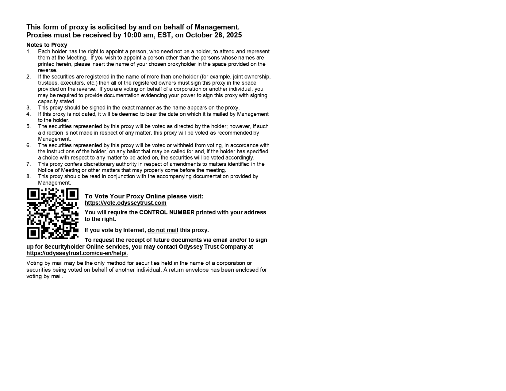This form of proxy is solicited by and on behalf of Management. Proxies must be received by 10:00 am, EST, on October 28, 2025 Notes to Proxy 1. Each holder has the right to appoint a person, who need not be a holder, to attend and represent them at the Meeting. If you wish to appoint a person other than the persons whose names are printed herein, please insert the name of your chosen proxyholder in the space provided on the reverse. 2. If the securities are registered in the name of more than one holder (for example, joint ownership, trustees, executors, etc.) then all of the registered owners must sign this proxy in the space provided on the reverse. If you are voting on behalf of a corporation or another individual, you may be required to provide documentation evidencing your power to sign this proxy with signing capacity stated. 3. This proxy should be signed in the exact manner as the name appears on the proxy. 4. If this proxy is not dated, it will be deemed to bear the date on which it is mailed by Management to the holder. 5. The securities represented by this proxy will be voted as directed by the holder; however, if such a direction is not made in respect of any matter, this proxy will be voted as recommended by Management. 6. The securities represented by this proxy will be voted or withheld from voting, in accordance with the instructions of the holder, on any ballot that may be called for and, if the holder has specified a choice with respect to any matter to be acted on, the securities will be voted accordingly . 7. This proxy confers discretionary authority in respect of amendments to matters identified in the Notice of Meeting or other matters that may properly come before the meeting. 8. This proxy should be read in conjunction with the accompanying documentation provided by Management. To Vote Your Proxy Online please visit: https://vote.odysseytrust.com You will require the CONTROL NUMBER printed with your address to the right. If you vote by Internet, do not mail this proxy. To request the receipt of future documents via email and/or to sign up for Securityholder Online services, you may contact Odyssey Trust Company at https://odysseytrust.com/ca - en/help/ . Voting by mail may be the only method for securities held in the name of a corporation or securities being voted on behalf of another individual. A return envelope has been enclosed for voting by mail.