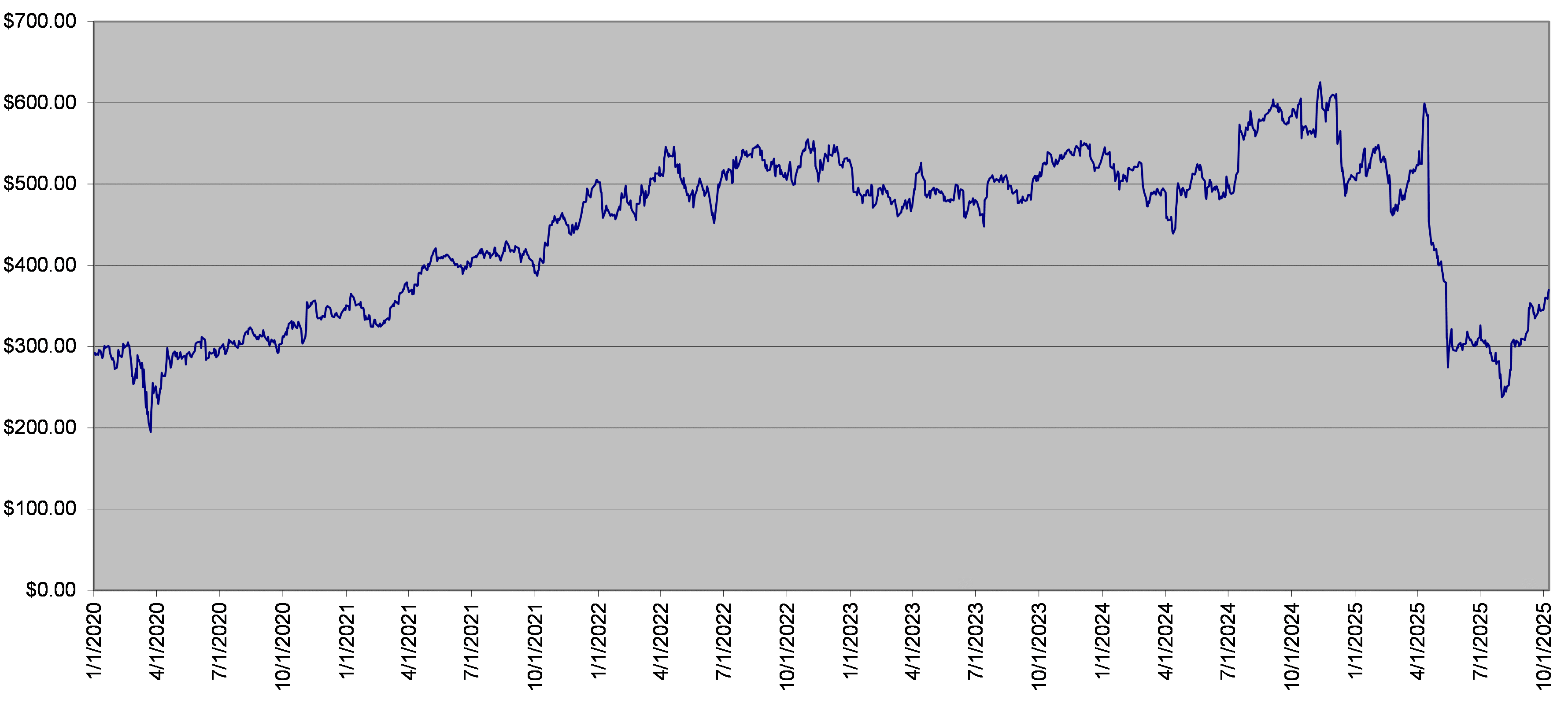 The closing level of the underlier on October 8, 2025 was $369.92. The following graph sets forth the daily closing levels of the underlier for the period noted below. We obtained the historical information presented in this document from Bloomberg Financial Markets, without independent verification. The underlier has at times experienced periods of high volatility. You should not take the historical closing levels of the underlier as an indication of its future performance, and no assurance can be given as to the closing level of the underlier at any time.