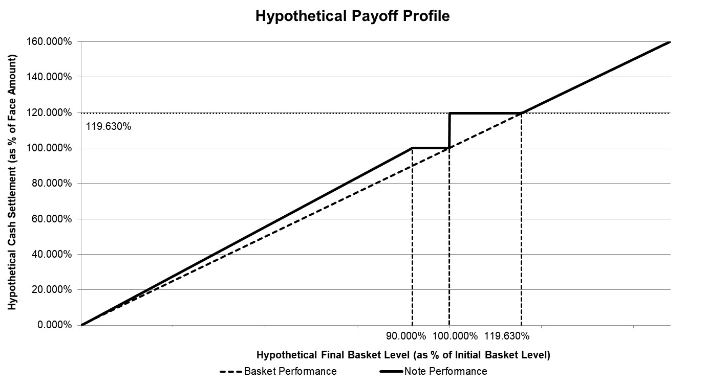 ●if the basket return is negative and is below -10.00% (the final basket level is less than the initial basket level by more than 10.00%), the sum of (i) $1,000 plus (ii) the product of (a) approximately 111.11% times (b) the sum of the basket return plus 10.00% times (c) $1,000.