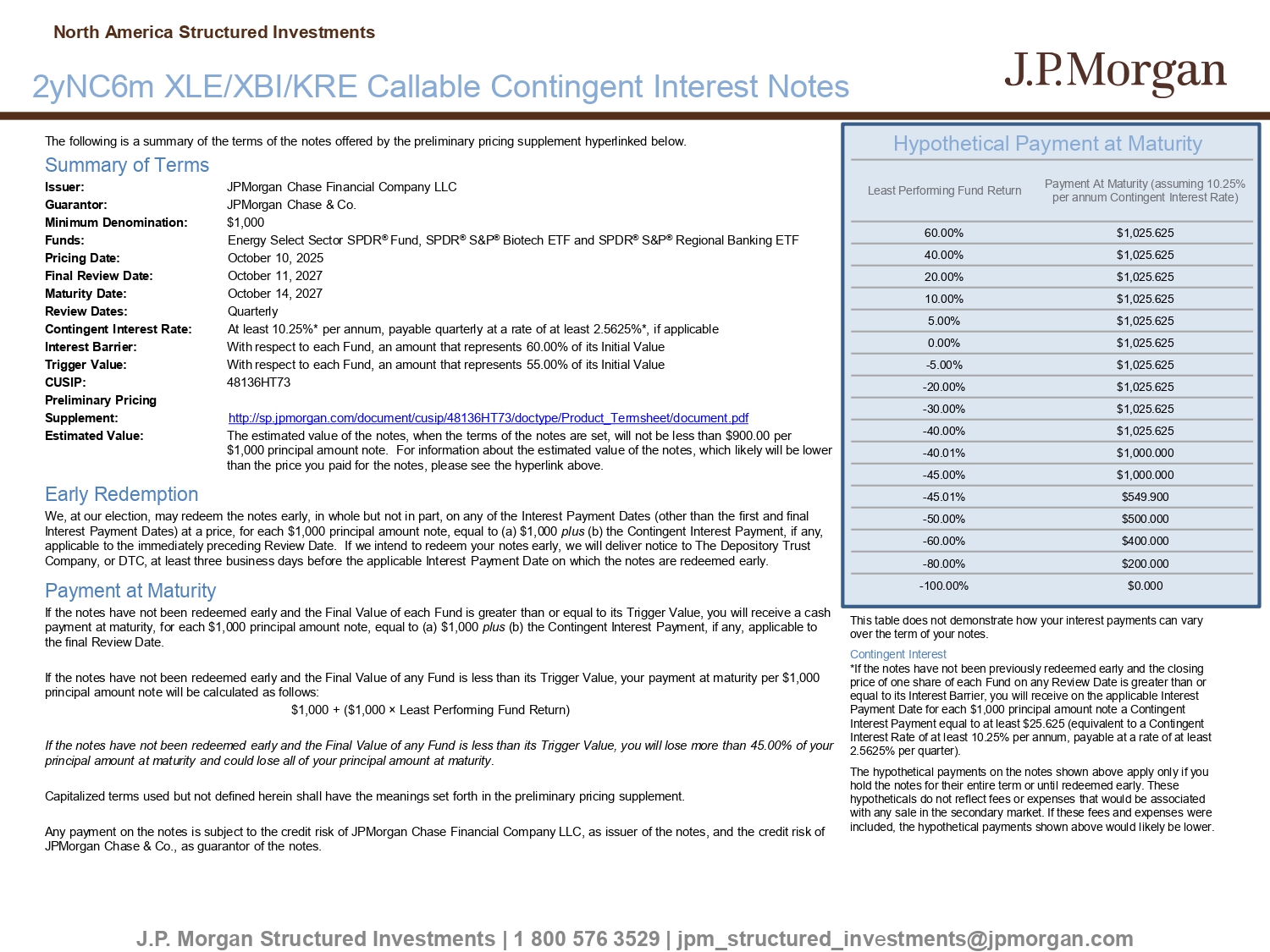 The following is a summary of the terms of the notes offered by the preliminary pricing supplement hyperlinked below. Summary of Terms Issuer: JPMorgan Chase Financial Company LLC Guarantor: JPMorgan Chase & Co. Minimum Denomination: $1,000 Funds: Energy Select Sector SPDR ® Fund, SPDR ® S&P ® Biotech ETF and SPDR ® S&P ® Regional Banking ETF Pricing Date: October 10, 2025 Final Review Date: October 11, 2027 Maturity Date: October 14, 2027 Review Dates: Quarterly Contingent Interest Rate: At least 10.25 %* per annum, payable quarterly at a rate of at least 2.5625 %*, if applicable Interest Barrier: With respect to each Fund, an amount that represents 60.00% of its Initial Value Trigger Value: With respect to each Fund, an amount that represents 55.00% of its Initial Value CUSIP: 48136HT73 Preliminary Pricing Supplement: http://sp.jpmorgan.com/document/cusip/48136HT73/doctype/Product_Termsheet/document.pdf Estimated Value: The estimated value of the notes, when the terms of the notes are set, will not be less than $900.00 per $1,000 principal amount note. For information about the estimated value of the notes, which likely will be lower than the price you paid for the notes, please see the hyperlink above. Early Redemption We, at our election, may redeem the notes early, in whole but not in part, on any of the Interest Payment Dates (other than t he first and final Interest Payment Dates) at a price, for each $1,000 principal amount note, equal to (a) $1,000 plus (b) the Contingent Interest Payment, if any, applicable to the immediately preceding Review Date. If we intend to redeem your notes early, we will deliver notice to The Dep ository Trust Company, or DTC, at least three business days before the applicable Interest Payment Date on which the notes are redeemed ear ly. Payment at Maturity If the notes have not been redeemed early and the Final Value of each Fund is greater than or equal to its Trigger Value, you wi ll receive a cash payment at maturity, for each $1,000 principal amount note, equal to (a) $1,000 plus (b) the Contingent Interest Payment, if any, applicable to the final Review Date. If the notes have not been redeemed early and the Final Value of any Fund is less than its Trigger Value, your payment at mat uri ty per $1,000 principal amount note will be calculated as follows: $1,000 + ($1,000 î Least Performing Fund Return) If the notes have not been redeemed early and the Final Value of any Fund is less than its Trigger Value, you will lose more tha n 45.00% of your principal amount at maturity and could lose all of your principal amount at maturity. Capitalized terms used but not defined herein shall have the meanings set forth in the preliminary pricing supplement. Any payment on the notes is subject to the credit risk of JPMorgan Chase Financial Company LLC, as issuer of the notes, and t he credit risk of JPMorgan Chase & Co., as guarantor of the notes. Hypothetical Payment at Maturity J.P. Morgan Structured Investments | 1 800 576 3529 | jpm_structured_inv e stments@jpmorgan.com 2yNC6m XLE/XBI/KRE Callable Contingent Interest Notes North America Structured Investments Payment At Maturity (assuming 10.25 % per annum Contingent Interest Rate) Least Performing Fund Return $1,0 25.625 60.00% $1,0 25.625 40.00% $1,0 25.625 20.00% $1,0 25.625 10.00% $1,0 25.625 5.00% $1,0 25.625 0.00% $1,0 25.625 - 5.00% $1,0 25.625 - 20.00% $1,0 25.625 - 30.00% $1,0 25.625 - 40.00% $1,000.000 - 40.01% $1,000.000 - 45.00% $549.900 - 45.01% $500.000 - 50.00% $400.000 - 60.00% $200.000 - 80.00% $0.000 - 100.00% This table does not demonstrate how your interest payments can vary over the term of your notes. Contingent Interest *If the notes have not been previously redeemed early and the closing price of one share of each Fund on any Review Date is greater than or equal to its Interest Barrier, you will receive on the applicable Interest Payment Date for each $1,000 principal amount note a Contingent Interest Payment equal to at least $ 25.625 (equivalent to a Contingent Interest Rate of at least 10.25 % per annum, payable at a rate of at least 2.5625 % per quarter). The hypothetical payments on the notes shown above apply only if you hold the notes for their entire term or until redeemed early. These hypotheticals do not reflect fees or expenses that would be associated with any sale in the secondary market. If these fees and expenses were included, the hypothetical payments shown above would likely be lower.
