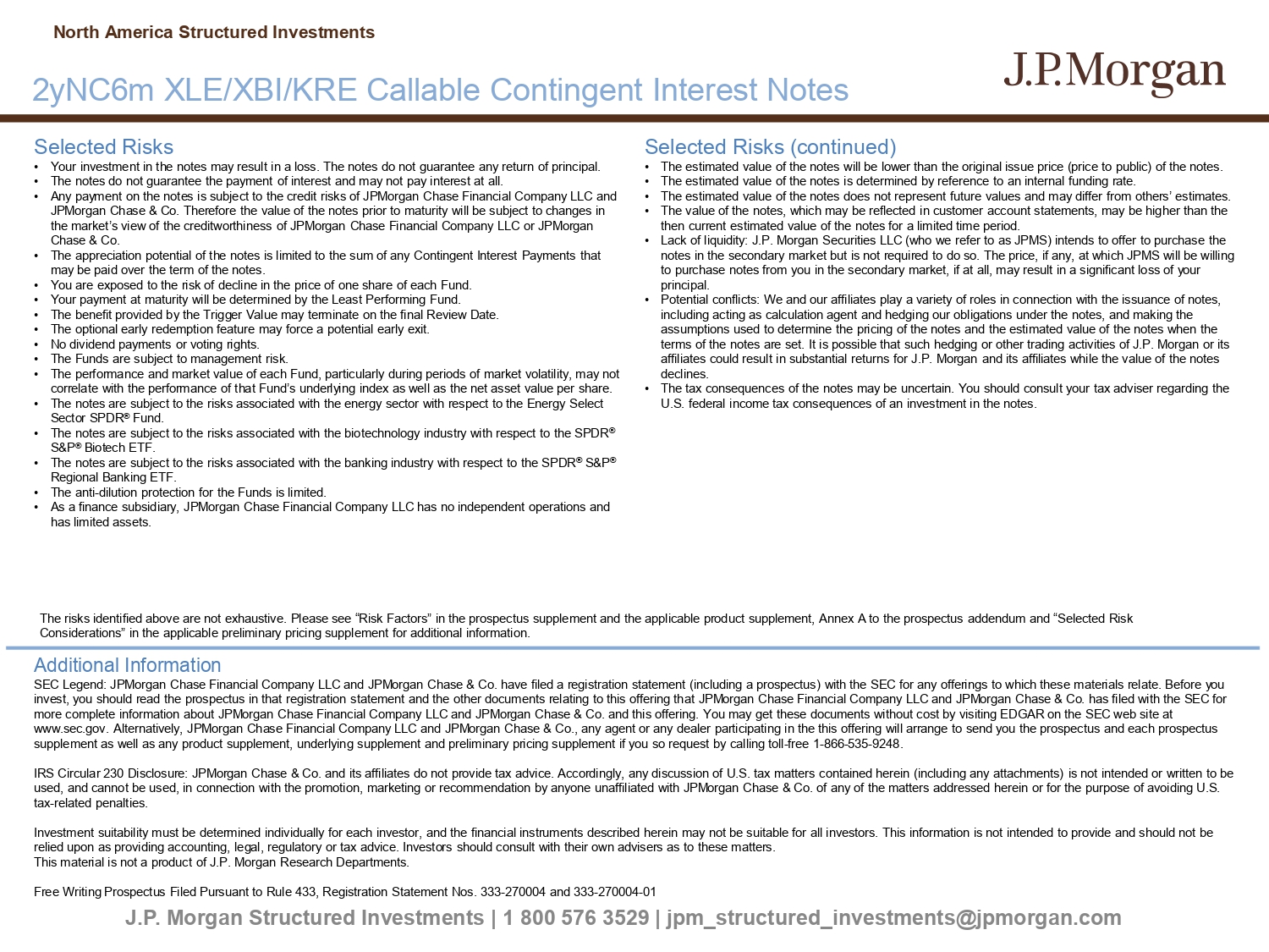 J.P. Morgan Structured Investments | 1 800 576 3529 | jpm_structured_investments@jpmorgan.com Selected Risks • Your investment in the notes may result in a loss. The notes do not guarantee any return of principal. • The notes do not guarantee the payment of interest and may not pay interest at all. • Any payment on the notes is subject to the credit risks of JPMorgan Chase Financial Company LLC and JPMorgan Chase & Co. Therefore the value of the notes prior to maturity will be subject to changes in the market’s view of the creditworthiness of JPMorgan Chase Financial Company LLC or JPMorgan Chase & Co. • The appreciation potential of the notes is limited to the sum of any Contingent Interest Payments that may be paid over the term of the notes. • You are exposed to the risk of decline in the price of one share of each Fund. • Your payment at maturity will be determined by the Least Performing Fund. • The benefit provided by the Trigger Value may terminate on the final Review Date. • The optional early redemption feature may force a potential early exit. • No dividend payments or voting rights. • The Funds are subject to management risk. • The performance and market value of each Fund, particularly during periods of market volatility, may not correlate with the performance of that Fund’s underlying index as well as the net asset value per share. • The notes are subject to the risks associated with the energy sector with respect to the Energy Select Sector SPDR ® Fund . • The notes are subject to the risks associated with the biotechnology industry with respect to the SPDR ® S&P ® Biotech ETF. • The notes are subject to the risks associated with the banking industry with respect to the SPDR ® S&P ® Regional Banking ETF. • The anti - dilution protection for the Funds is limited. • As a finance subsidiary, JPMorgan Chase Financial Company LLC has no independent operations and has limited assets. Selected Risks (continued) • The estimated value of the notes will be lower than the original issue price (price to public) of the notes. • The estimated value of the notes is determined by reference to an internal funding rate. • The estimated value of the notes does not represent future values and may differ from others’ estimates. • The value of the notes, which may be reflected in customer account statements, may be higher than the then current estimated value of the notes for a limited time period. • Lack of liquidity: J.P. Morgan Securities LLC (who we refer to as JPMS) intends to offer to purchase the notes in the secondary market but is not required to do so. The price, if any, at which JPMS will be willing to purchase notes from you in the secondary market, if at all, may result in a significant loss of your principal. • Potential conflicts: We and our affiliates play a variety of roles in connection with the issuance of notes, including acting as calculation agent and hedging our obligations under the notes, and making the assumptions used to determine the pricing of the notes and the estimated value of the notes when the terms of the notes are set. It is possible that such hedging or other trading activities of J.P. Morgan or its affiliates could result in substantial returns for J.P. Morgan and its affiliates while the value of the notes declines. • The tax consequences of the notes may be uncertain. You should consult your tax adviser regarding the U.S. federal income tax consequences of an investment in the notes. Additional Information SEC Legend: JPMorgan Chase Financial Company LLC and JPMorgan Chase & Co. have filed a registration statement (including a pr osp ectus) with the SEC for any offerings to which these materials relate. Before you invest, you should read the prospectus in that registration statement and the other documents relating to this offering that JPM organ Chase Financial Company LLC and JPMorgan Chase & Co. has filed with the SEC for more complete information about JPMorgan Chase Financial Company LLC and JPMorgan Chase & Co. and this offering. You may get the se documents without cost by visiting EDGAR on the SEC web site at www.sec.gov. Alternatively, JPMorgan Chase Financial Company LLC and JPMorgan Chase & Co., any agent or any dealer participat ing in the this offering will arrange to send you the prospectus and each prospectus supplement as well as any product supplement, underlying supplement and preliminary pricing supplement if you so request by c all ing toll - free 1 - 866 - 535 - 9248. IRS Circular 230 Disclosure: JPMorgan Chase & Co. and its affiliates do not provide tax advice. Accordingly, any discussion o f U .S. tax matters contained herein (including any attachments) is not intended or written to be used, and cannot be used, in connection with the promotion, marketing or recommendation by anyone unaffiliated with JPMorgan Cha se & Co. of any of the matters addressed herein or for the purpose of avoiding U.S. tax - related penalties. Investment suitability must be determined individually for each investor, and the financial instruments described herein may not be suitable for all investors. This information is not intended to provide and should not be relied upon as providing accounting, legal, regulatory or tax advice. Investors should consult with their own advisers as to the se matters. This material is not a product of J.P. Morgan Research Departments. Free Writing Prospectus Filed Pursuant to Rule 433, Registration Statement Nos. 333 - 270004 and 333 - 270004 - 01 North America Structured Investments 2yNC6m XLE/XBI/KRE Callable Contingent Interest Notes The risks identified above are not exhaustive. Please see “Risk Factors” in the prospectus supplement and the applicable prod uct supplement, Annex A to the prospectus addendum and “Selected Risk Considerations” in the applicable preliminary pricing supplement for additional information.