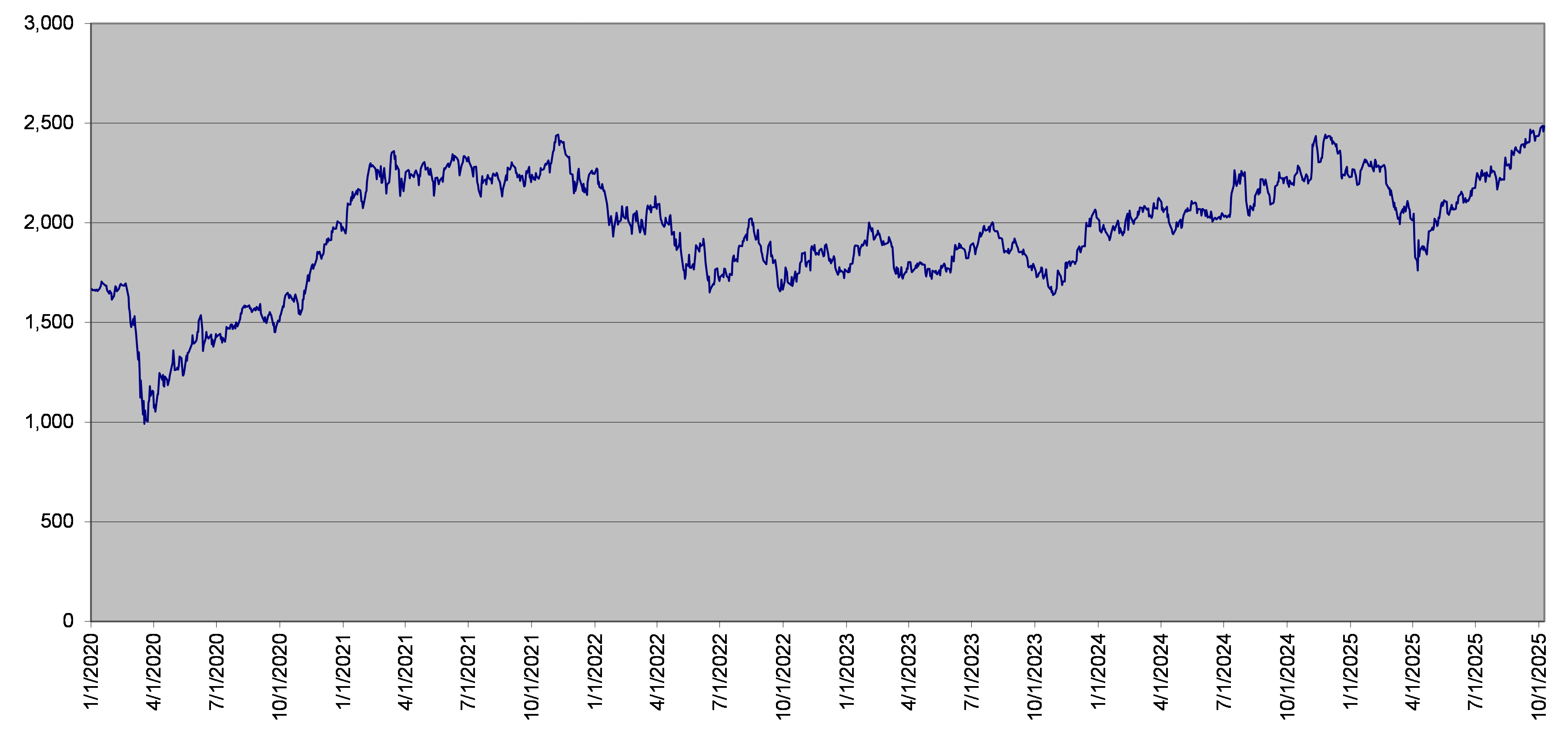 SPX Index Daily Closing Levels January 1, 2020 to October 8, 2025 |