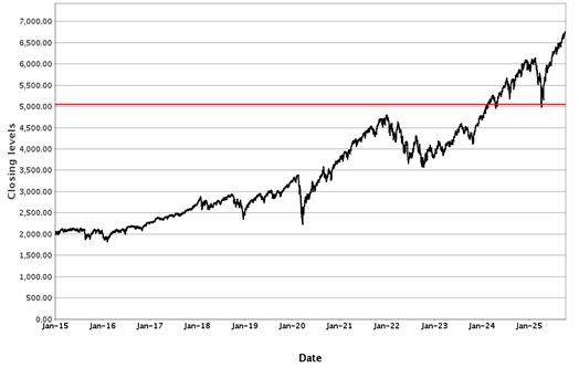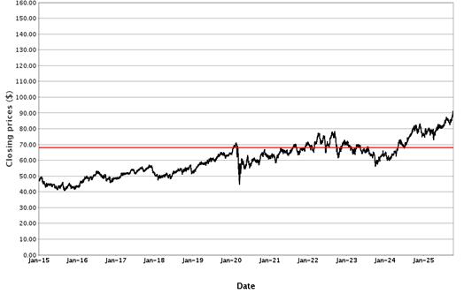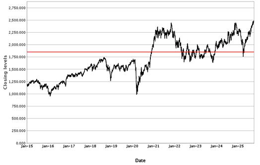 The following graphs set forth historical closing values of the Underliers for the period from January 1, 2015 to October 9, 2025. Each red line represents a hypothetical Buffer Value based on the closing value of the relevant Underlier on October 9, 2025. We obtained the information in the graphs from Bloomberg Financial Markets, without independent investigation. We cannot give you assurance that the performance of the Underliers will result in the return of all of your initial investment.