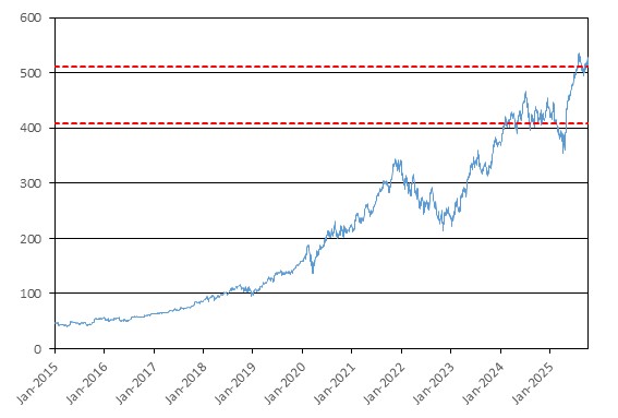 The table below sets forth the published high and low closing prices, as well as end-of-quarter closing price, of the underlying equity for the specified period. The closing price of the underlying equity on October 10, 2025 was $510.96. The associated graph shows the closing prices of the underlying equity for each day from January 1, 2015 to October 10, 2025. The dotted lines represent the downside threshold level of $408.77 and the call threshold level of $510.96, which are equal to 80.00% and 100.00%, respectively, of the initial price. We obtained the information in the table below from Bloomberg Professional® service (“Bloomberg”), without independent verification. The closing prices may be adjusted by Bloomberg for corporate actions such as stock splits, public offerings, mergers and acquisitions, spin-offs, delistings and bankruptcy. UBS has not undertaken an independent review or due diligence of any publicly available information obtained from Bloomberg. The historical performance of the underlying equity should not be taken as an indication of its future performance, and no assurance can be given as to the price of the underlying equity at any time, including the determination dates.