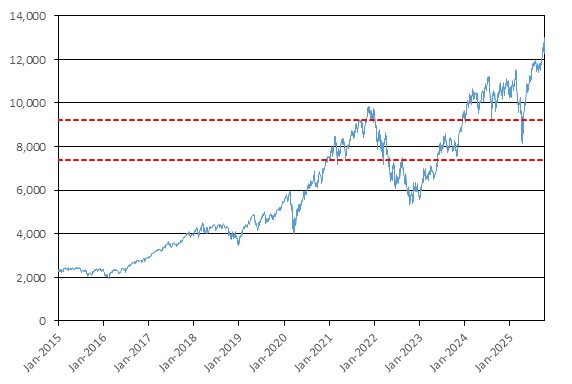 The graph below illustrates the performance of NDXT from January 1, 2015 through October 10, 2025, based on the daily closing levels as reported by Bloomberg, without independent verification. UBS has not conducted any independent review or due diligence of any publicly available information obtained from Bloomberg. The closing level of NDXT on October 10, 2025 was 12,280.54. The dotted lines represent its coupon barrier of 9,210.41, which is equal to 75.00% of its initial level, and its downside threshold of 7,368.32, which is equal to 60.00% of its initial level. Past performance of the underlying asset is not indicative of the future performance of the underlying asset during the term of the Notes.