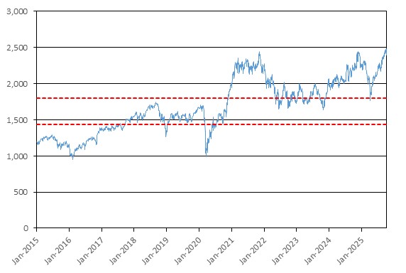 The graph below illustrates the performance of RTY from January 1, 2015 through October 10, 2025, based on the daily closing levels as reported by Bloomberg, without independent verification. UBS has not conducted any independent review or due diligence of any publicly available information obtained from Bloomberg. The closing level of RTY on October 10, 2025 was 2,394.595. The dotted lines represent its coupon barrier of 1,795.946, which is equal to 75.00% of its initial level, and its downside threshold of 1,436.757, which is equal to 60.00% of its initial level. Past performance of the underlying asset is not indicative of the future performance of the underlying asset during the term of the Notes.